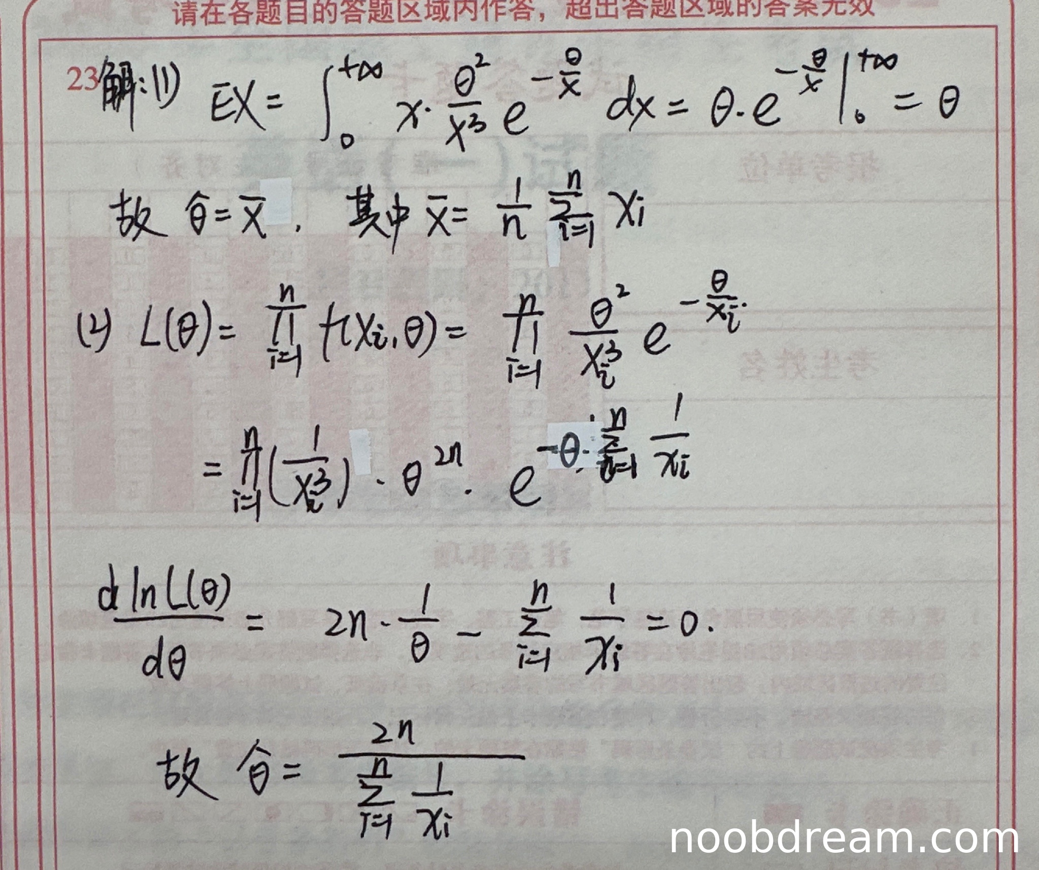 学生作答中最大似然估计的求解过程基本正确。从似然函数的构建、取对数、求导到解方程得到估计量的整个过程都与标准答案一致。虽然学生使用了小写 x_i 而不是大写 X_i 来表示样本观测值,但这不影响对方法的理解。因此这部分给满分5.5分。