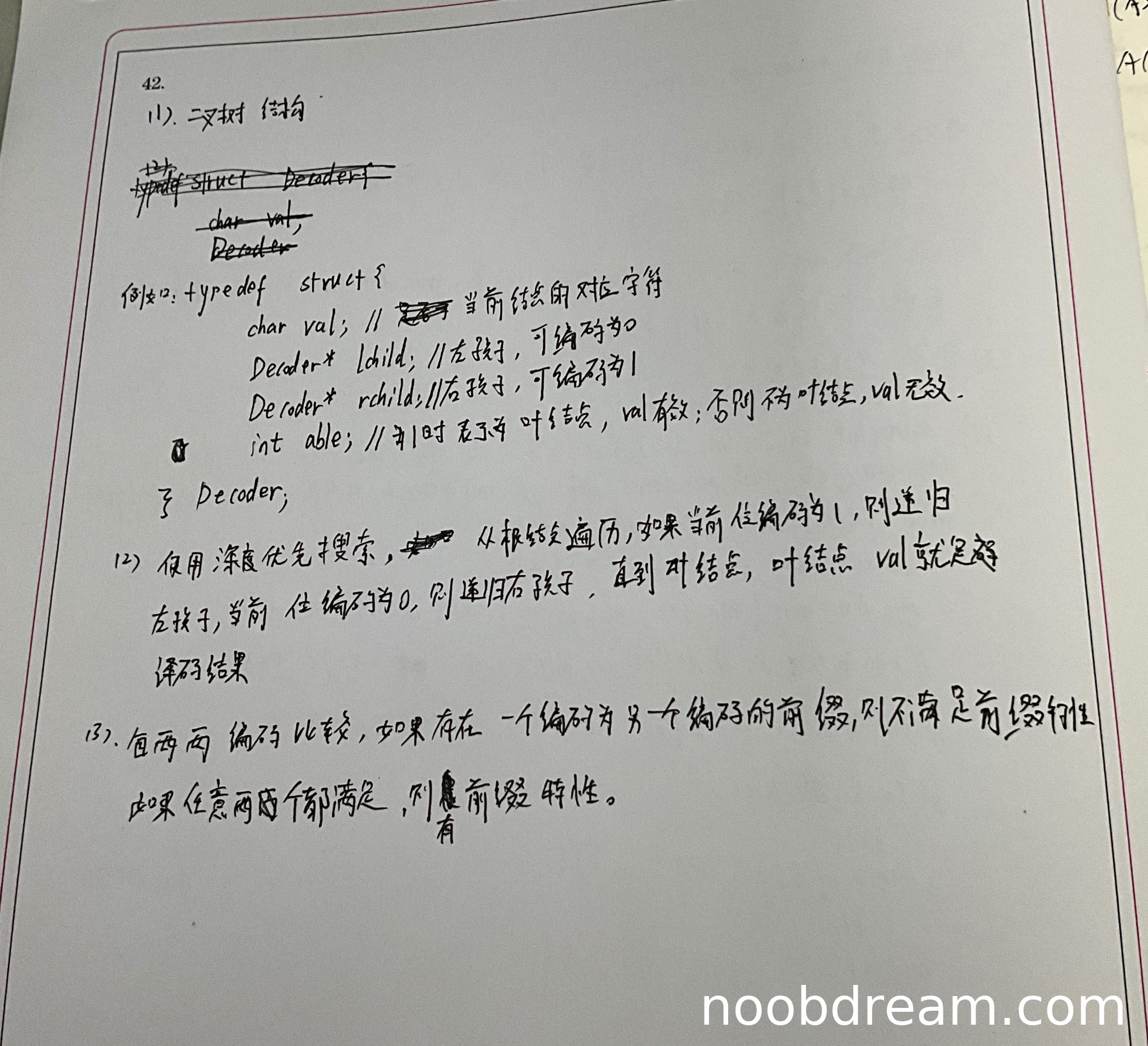 学生回答使用二叉树结构来保存具有前缀特性的不等长编码,这是正确的数据结构。虽然学生给出的结构体定义中,对于左孩子和右孩子的编码方向(0对应左还是右)以及able字段的含义描述存在一些混淆(例如,标准答案中通常左路径标0、右路径标1,而学生描述中可能写反了),但核心思想是使用二叉树结构,这符合标准答案的要求。由于识别可能存在误写,且主要逻辑正确,因此不扣分。得4分。
