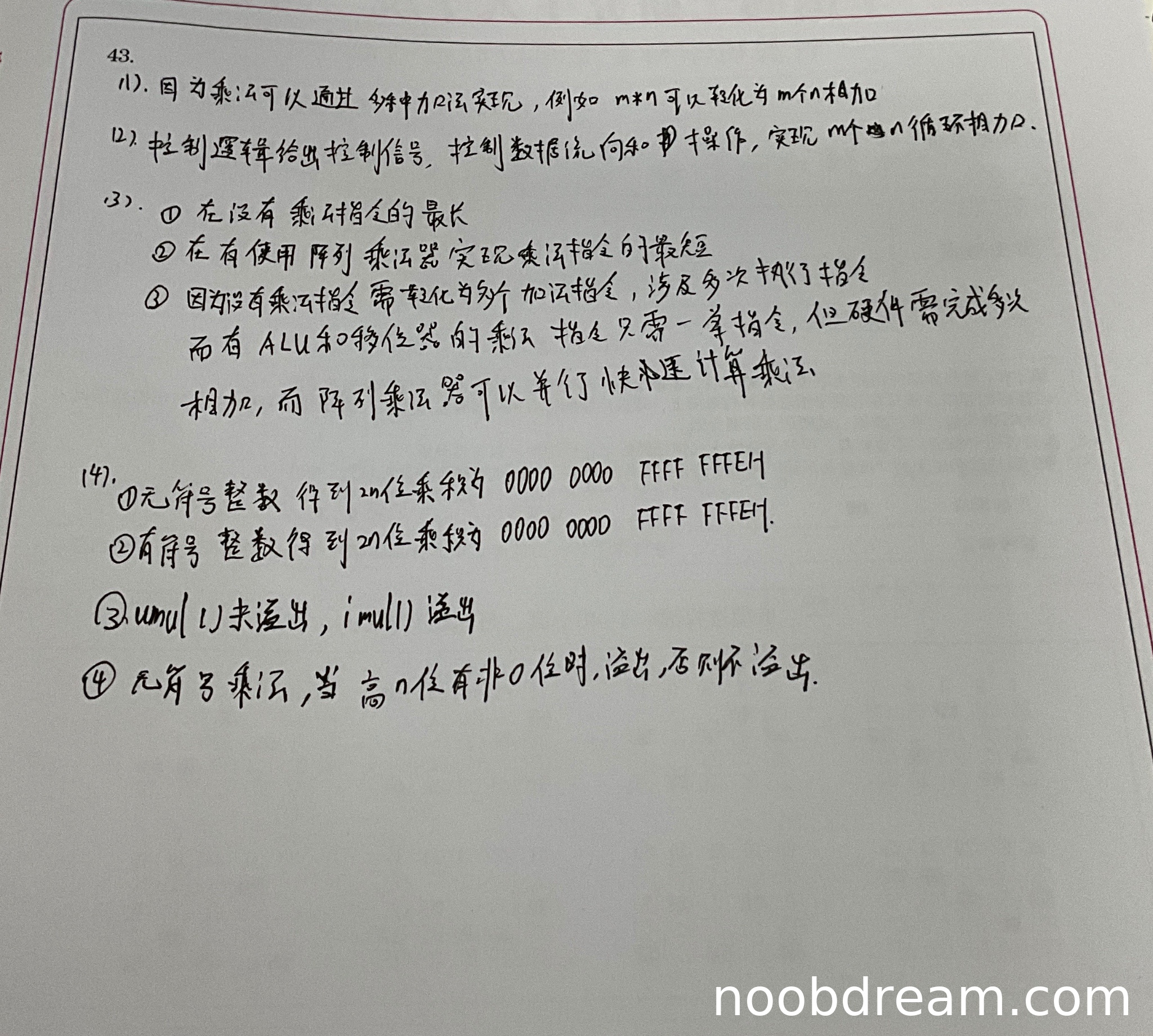 理由:学生回答"乘法可以通过多种加法实现,例如m×n可以转化为m个n相加",这确实是实现乘法的一种基本思路,说明了乘法可以通过加法实现。但标准答案更准确地指出需要结合移位操作,并且提到了具体的实现方法如Booth乘法。学生回答不够完整,扣1分。
