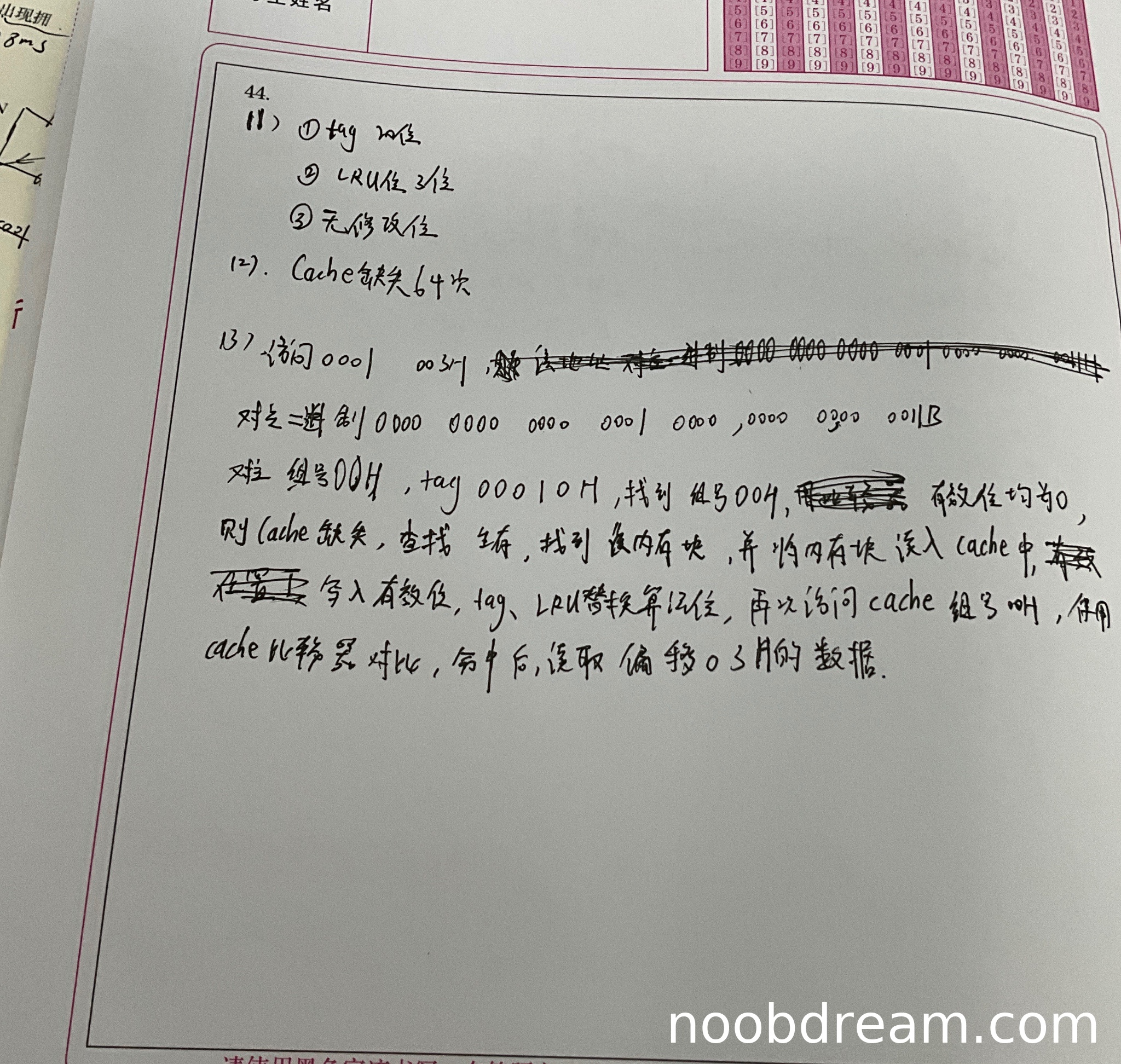 学生第二次识别结果:Tag位数正确(20位),LRU位错误(应为3位,学生写2位),无修改位正确。LRU位错误扣1分,得2分。