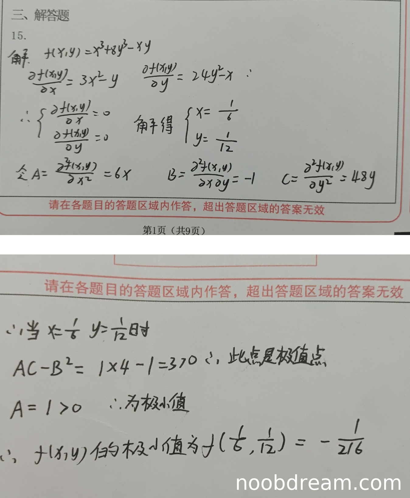 学生两次识别结果中,第一次识别将函数误写为 \(f(x,y)=x^3+8y^2-xy\),但第二次识别正确为 \(f(x,y)=x^3+8y^3-xy\)。根据禁止扣分规则,由于存在识别错误可能性,且第二次识别正确,不扣分。一阶偏导数计算完全正确,得2分。