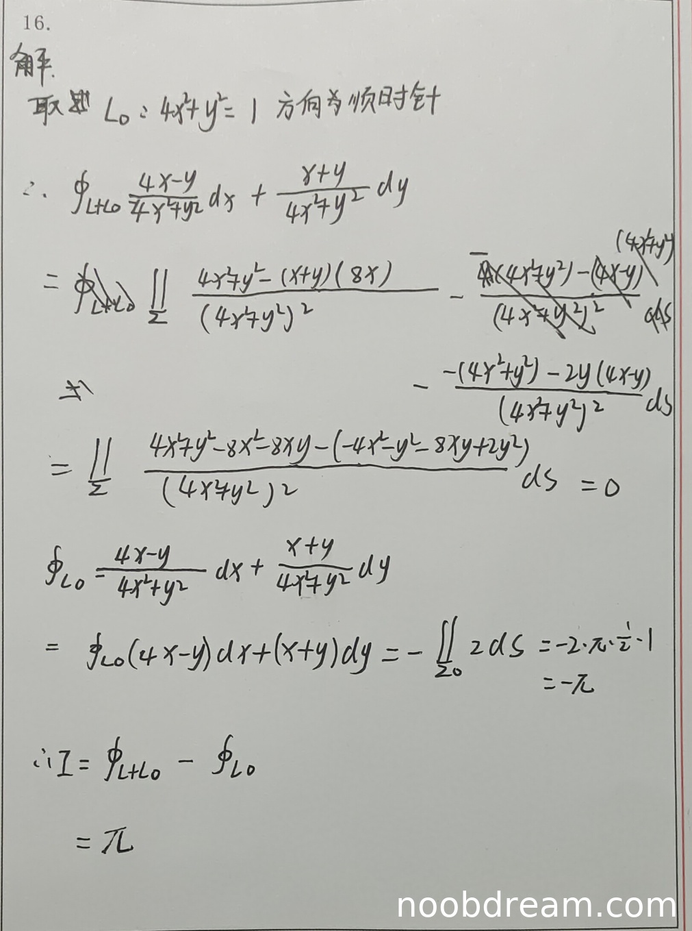 - 在计算椭圆面积时,椭圆 4x²+y²=1 的面积应为 π·(1/2)·1 = π/2,但学生在计算 ∮(4x-y)dx+(x+y)dy 时直接得到 -2·π·(1/2)·1 = -π,这个计算过程不完整(缺少对格林公式中偏导数的具体计算)