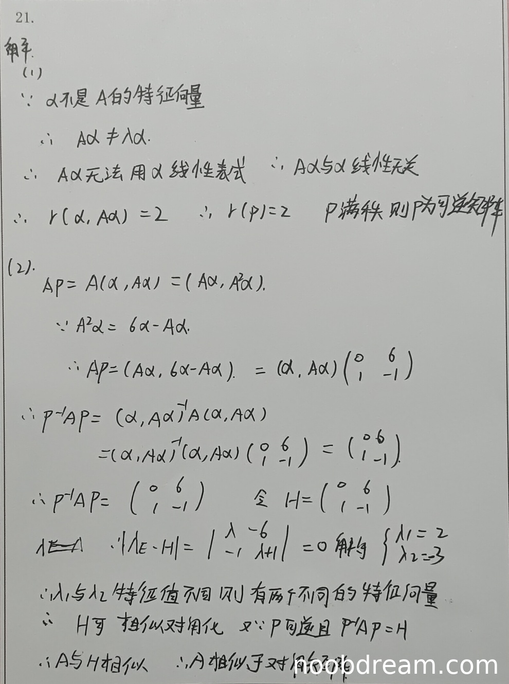 学生正确证明了P的可逆性。理由:学生指出α不是A的特征向量,因此Aα无法用α线性表示,从而α与Aα线性无关,故P满秩可逆。这与标准答案法2的思路一致,逻辑完整正确。得5分。