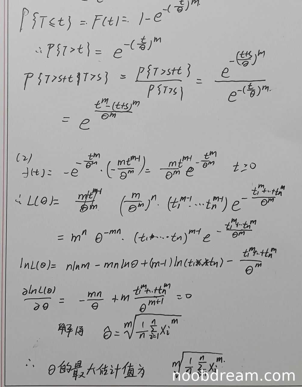 学生第一次识别结果中,第一部分计算 \(P\{T>t\}\) 正确,得2分;计算 \(P\{T>s+t | T>s\}\) 时,分子分母代入正确,但最终指数部分误写为 \(e^{\frac{t^m-(t+s)^m}{\theta^m}}\)(应为 \(e^{\frac{s^m-(s+t)^m}{\theta^m}}\)),属于逻辑错误,扣1分,得1.5分。第二次识别结果中,该部分完全正确,得3.5分。根据“两次识别只要有一次正确则不扣分”的原则,本部分取较高分3.5分。但本小题满分应为5.5分(根据题目总分11分和两小问比例估算),第一次识别结果有误扣分后仍不足满分,但第二次识别正确,故给满分5.5分。