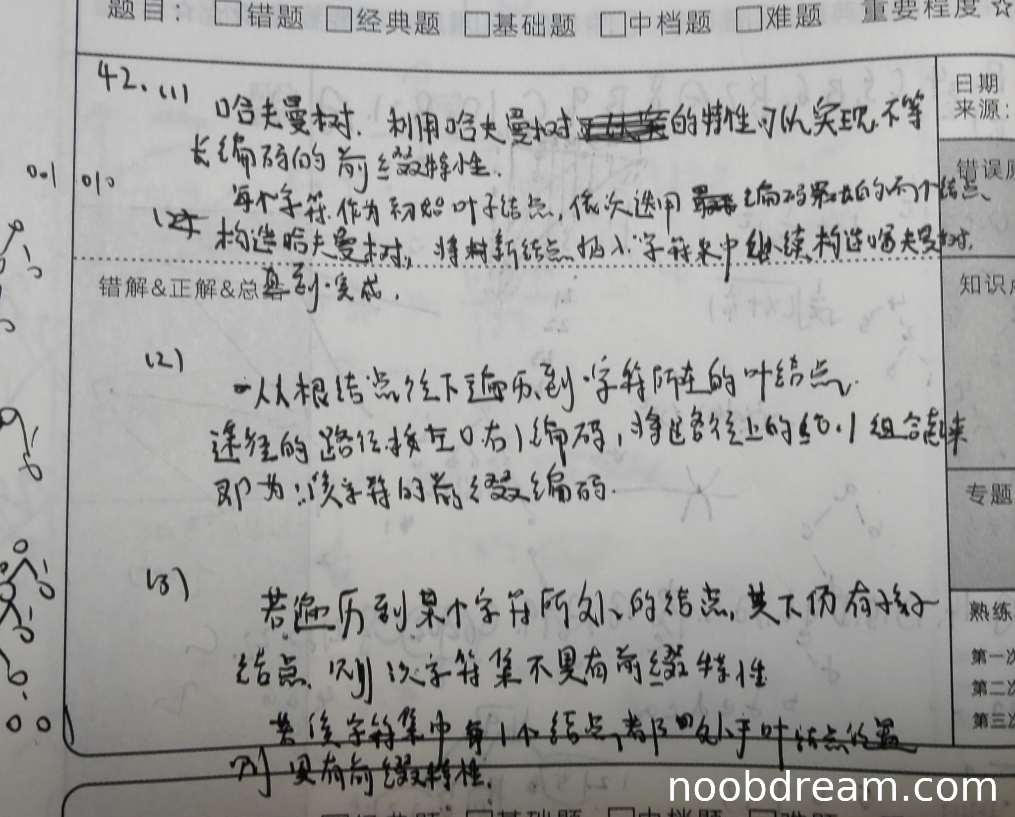 学生描述了从根结点到叶结点的路径生成编码的过程(左0右1),但问题要求的是从0/1串到字符串的译码过程,而学生回答的是编码过程,属于逻辑错误。译码应是从根开始按0/1序列遍历到叶结点输出字符,并重复此过程。扣2分。得1分。