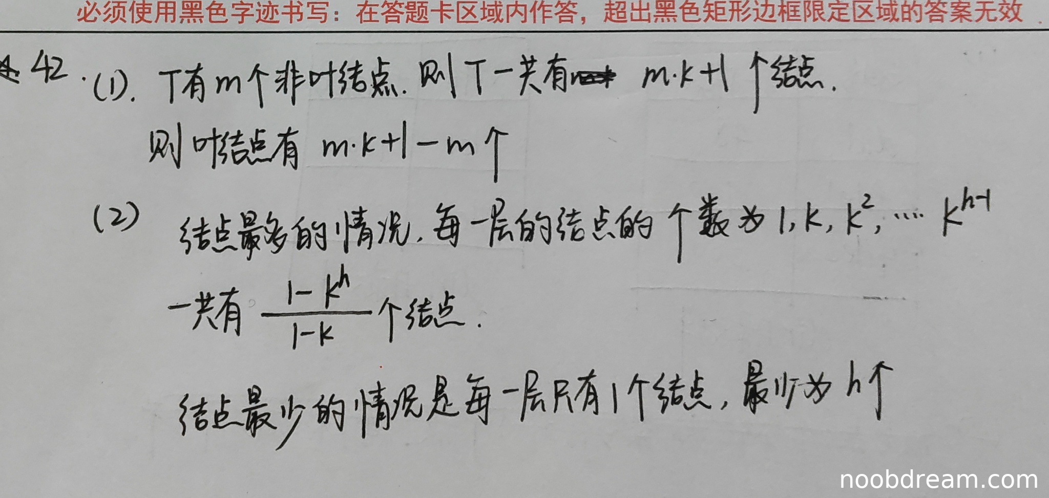 学生答案中,最多结点情况:给出了每层结点数序列 \( 1, k, k^2, \dots, k^{h-1} \) 和求和公式 \( \frac{1 - k^h}{1 - k} \),即 \( \frac{k^h - 1}{k - 1} \),与标准答案一致,得3分。