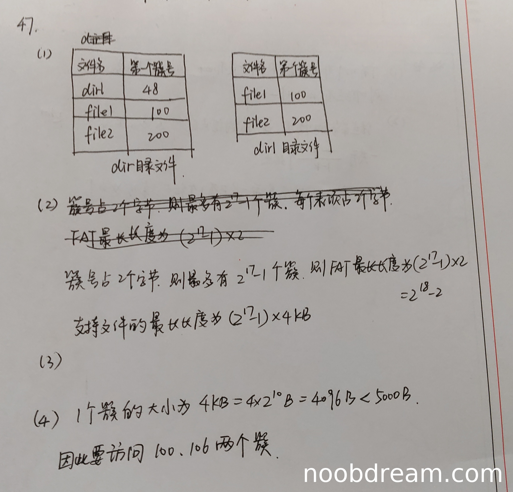学生回答需要访问100、106两个簇。但根据题目,需先通过dir目录找到dir1(簇48),再通过dir1找到file1的起始簇100,然后计算5000字节所在簇(106)。学生遗漏了目录簇48,逻辑错误。扣1分,得1分。
