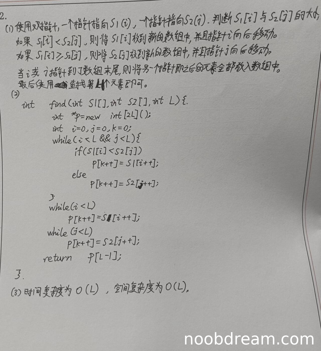 理由:学生实现的代码基于合并两个数组的思路,虽然代码逻辑正确(能够合并两个升序数组并返回第L个元素),但不符合题目对高效算法的要求。关键问题包括:①使用了O(L)的额外空间,而最优解应为O(1);②时间复杂度为O(L),而最优解应为O(log₂n);③没有利用序列等长的特性进行优化。此外,代码返回的是p[L-1],但两个长度为L的序列合并后中位数应该是第L个元素(因为总长度为2L,中位数是第L个),这一点计算正确,但方法整体不符合高效要求。