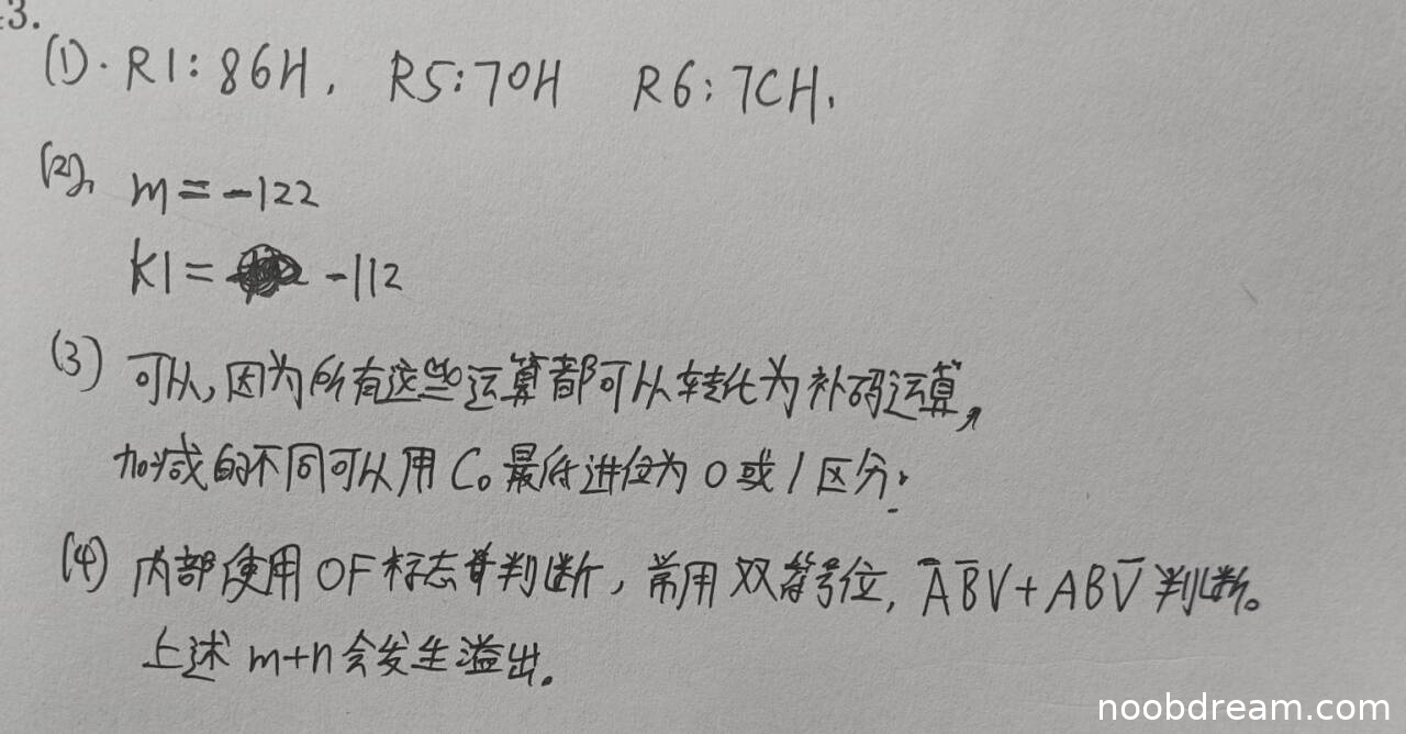 学生正确识别出m+n会发生溢出,但在判断方法上表述不够清晰。标准答案明确给出"最高位进位和符号位的进位不同"的判断方法,而学生的$\overline{A}\overline{B}V+AB\overline{V}$公式表述存在识别问题,可能为误写。根据"存在识别错误的可能性较高"和"误写导致的逻辑错误不扣分"原则,且核心溢出判断正确,扣1分,得2分。