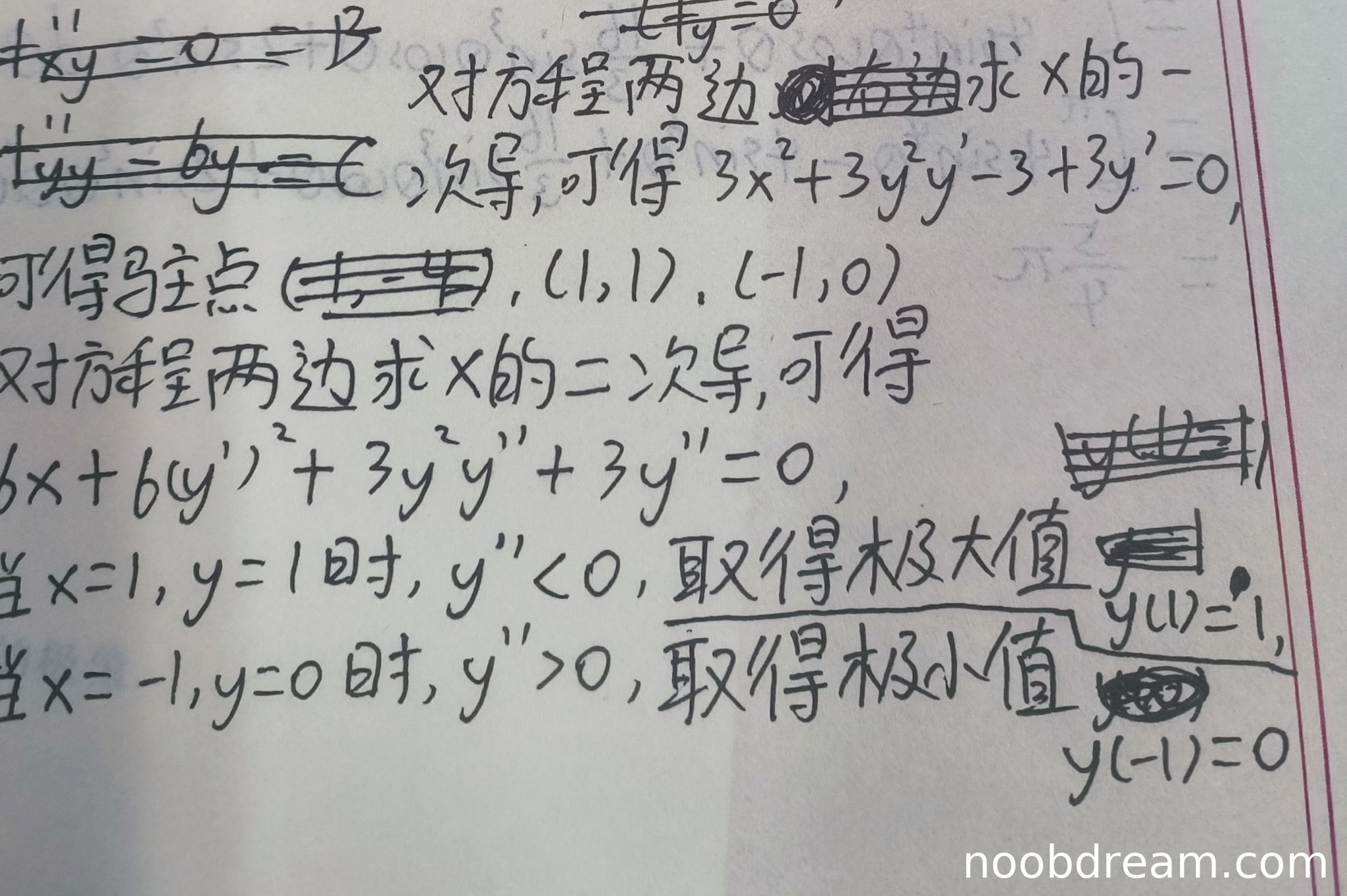 学生作答给出了正确的极值点(1,1)和(-1,0),并正确判断了极大值和极小值。虽然第一次识别结果中"驻点(看不清)"部分表述不够清晰,但第二次识别完整展示了求导过程。在二阶导数判断部分,学生正确计算了y''的符号并得出正确结论。