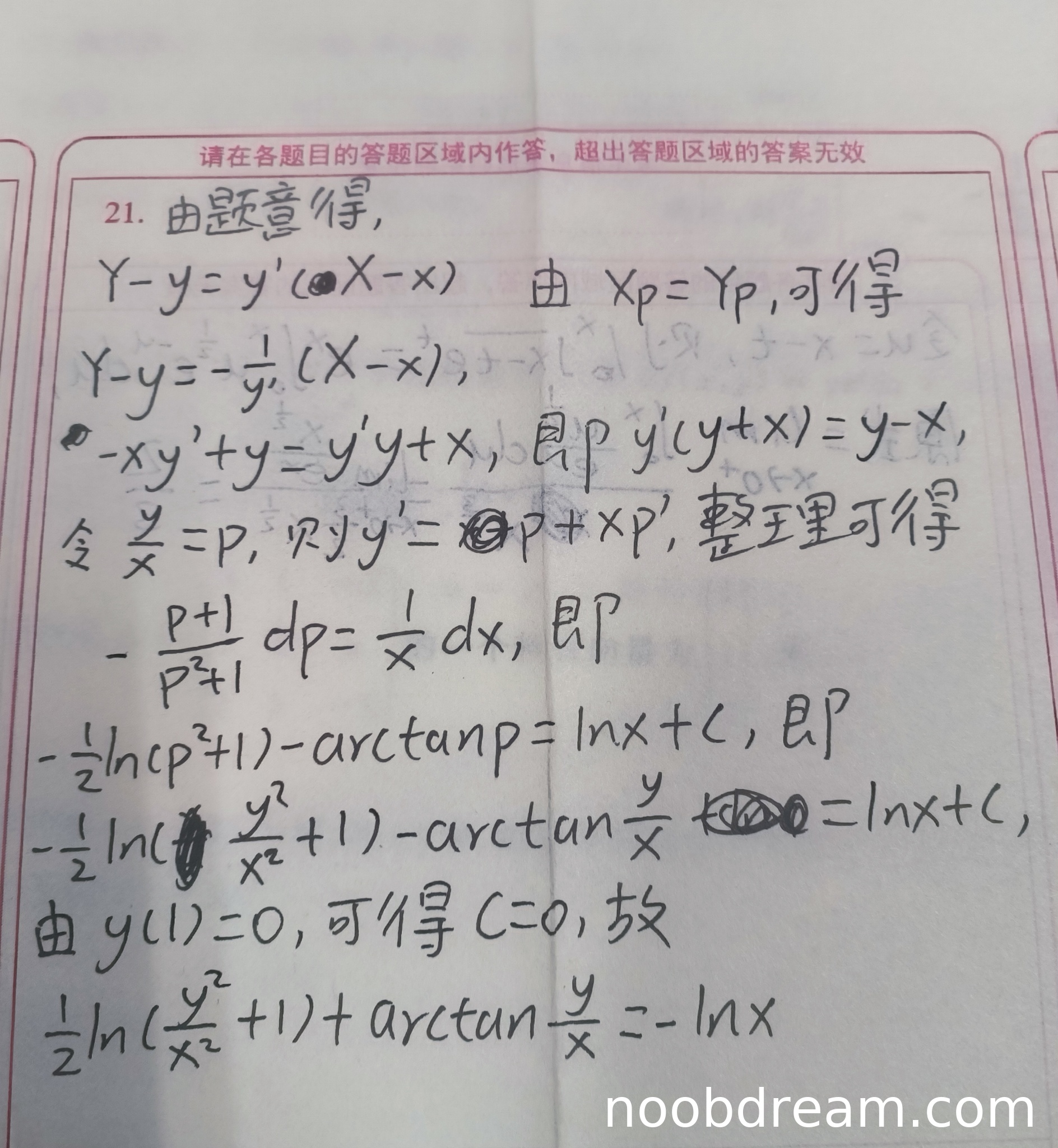 学生正确建立了切线方程和法线方程,并正确求出与坐标轴的交点:切线在y轴截距为 \(Y_P = y - xy'\),法线在x轴截距为 \(X_P = x + yy'\)。然后根据条件 \(X_P = Y_P\) 得到方程 \(y - xy' = x + yy'\),整理得 \(y' = \frac{y-x}{y+x}\)。这一步完全正确,得3分。