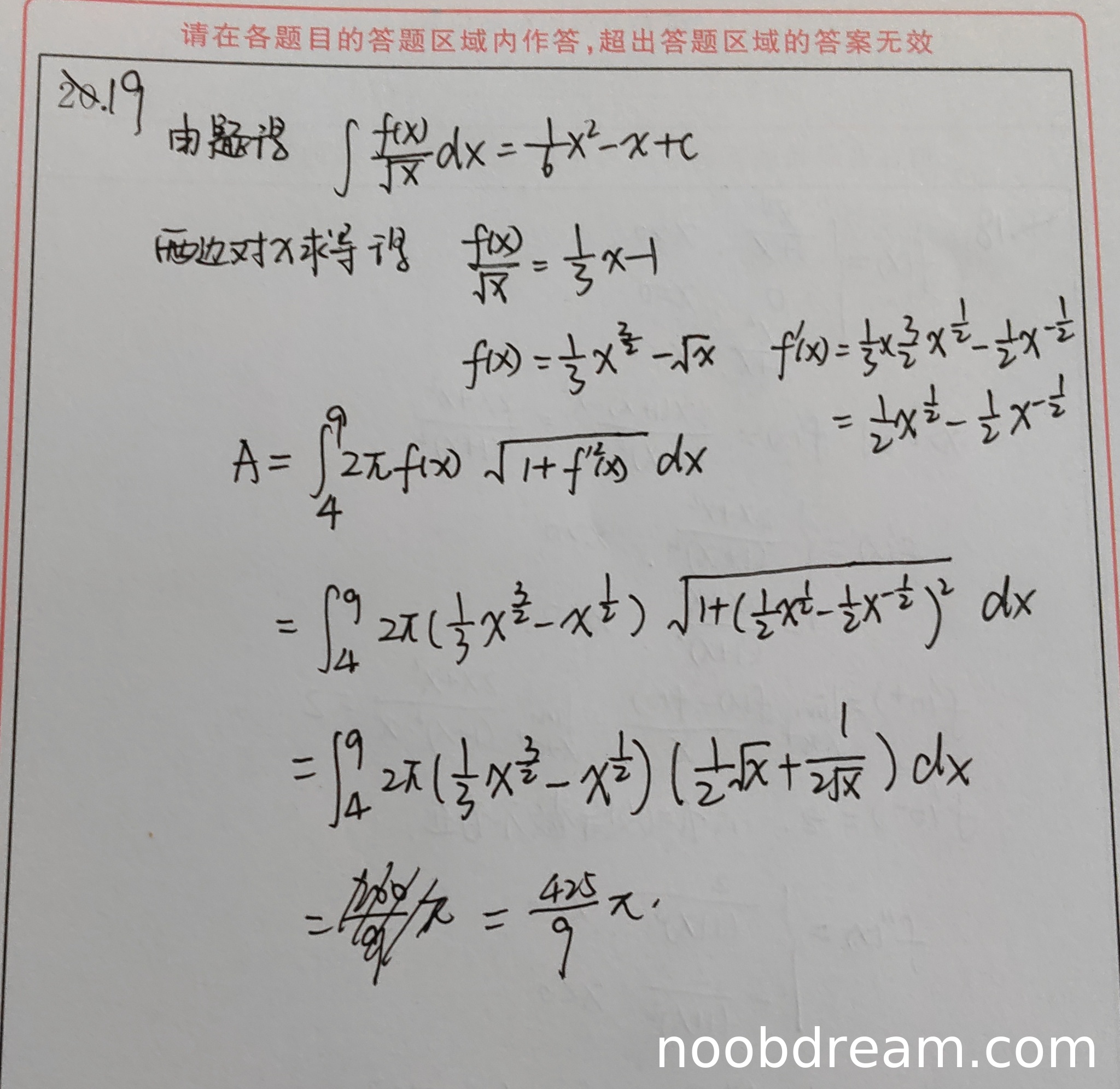 学生作答中完全没有提到曲线长度S的计算,标准答案中S的计算过程为:先求导得到f'(x),然后代入弧长公式计算。学生只计算了旋转曲面面积A,没有涉及S,因此S部分得0分。