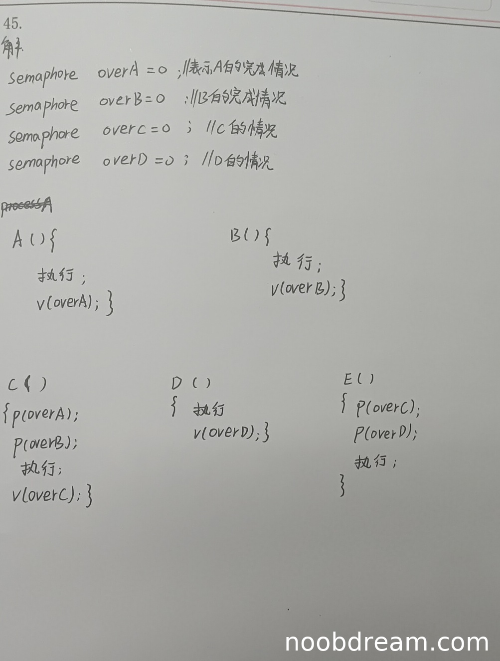 进程A、B、D的实现正确:A执行后V(overA),B执行后V(overB),D执行后V(overD),符合无前置任务的要求。得2分。