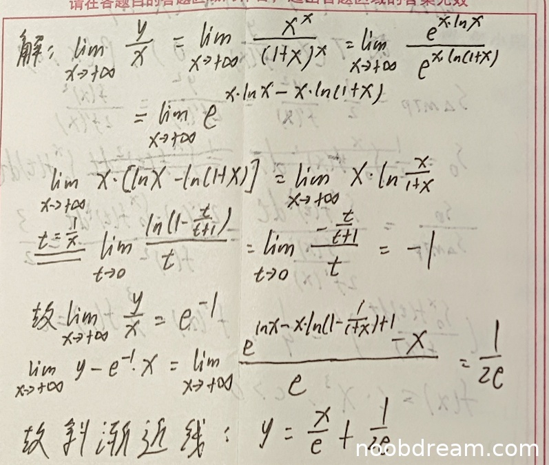 此部分为最终答案的书写,学生正确写出了斜渐近线方程y=x/e+1/(2e),与标准答案一致。但此部分不单独计分,已包含在前两部分评分中。