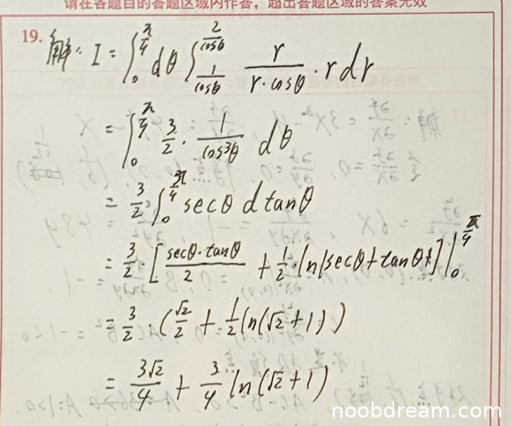 - 对r积分正确:∫rdr从secθ到2secθ得到(1/2)[(2secθ)² - (secθ)²] = (1/2)(4sec²θ - sec²θ) = (3/2)sec²θ,再乘以1/cosθ得到(3/2)sec³θ。