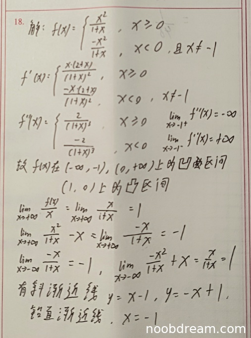 学生正确求出了铅直渐近线x=-1,斜渐近线y=x-1(x→+∞时)和y=-x+1(x→-∞时)。计算过程和结果完全正确,思路清晰。虽然学生在凹凸区间部分有严重错误,但渐近线部分独立完整且正确,给满分5分。