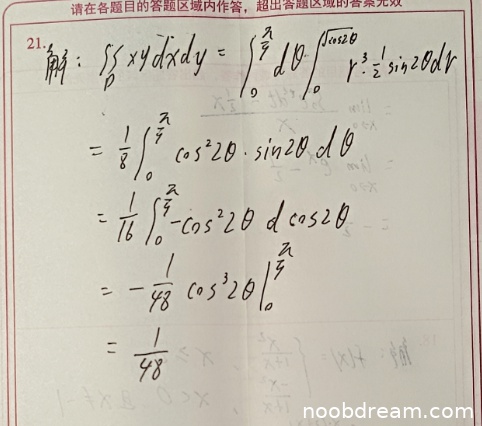 第二次识别结果中,学生明确将θ范围设为[0, π/2],并进行了计算,得到中间结果0,这与正确答案不符。但随后学生又展示了另一种计算方法(可能是参考标准答案),并最终得到1/48。