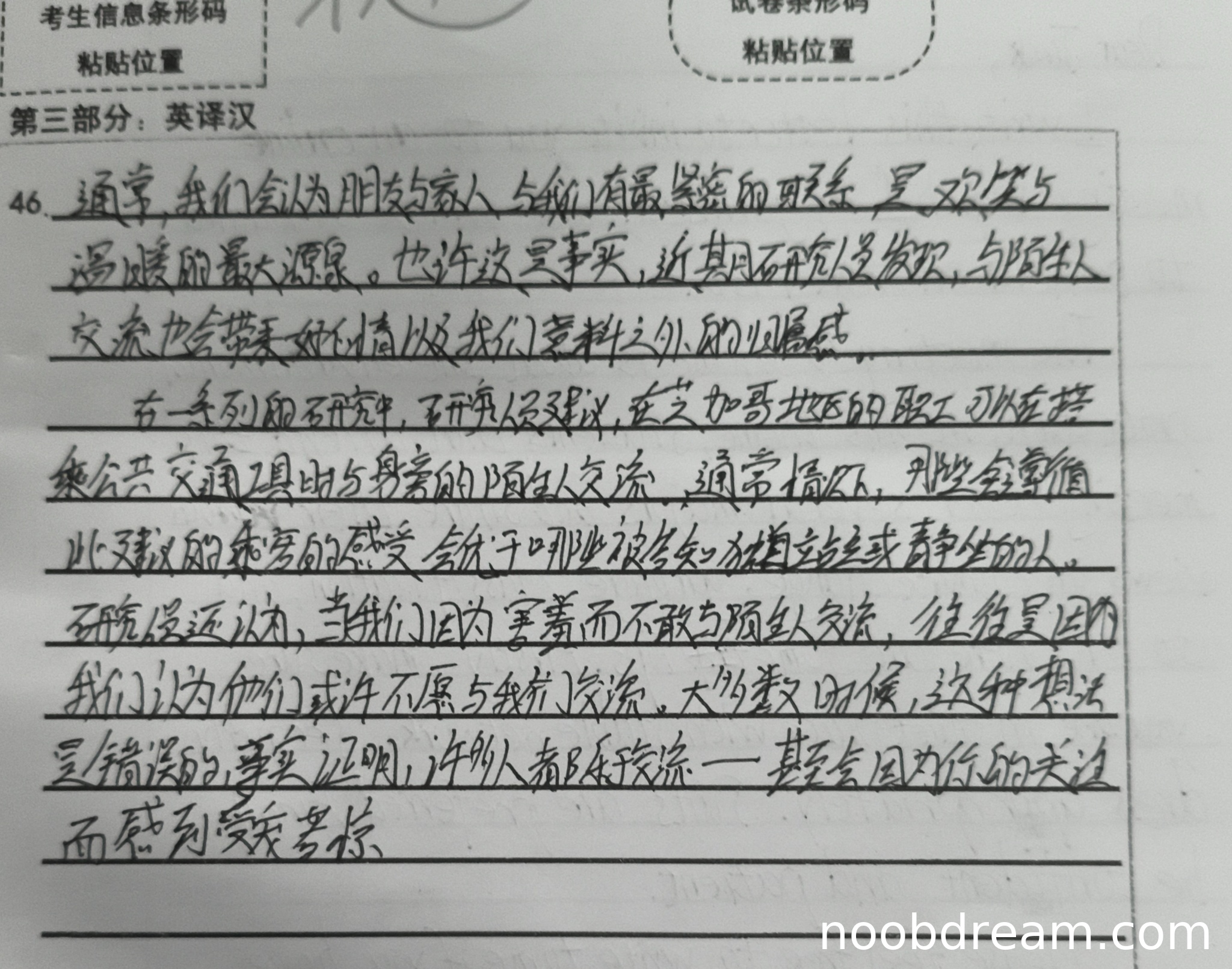 理由:学生翻译准确传达了原文的核心意思,将"friends and family members are our biggest sources of connection, laughter, and warmth"译为"朋友与家人与我们有最紧密的联系,是欢笑与温暖的最大源泉"表达恰当。"interacting with strangers actually brings a boost in mood and feelings of belonging"译为"与陌生人交流也会带来好心情以及我们意料之外的归属感"基本准确。扣1分主要因为"connection"译为"联系"稍显宽泛,标准答案的"情感"更贴合原文语境。