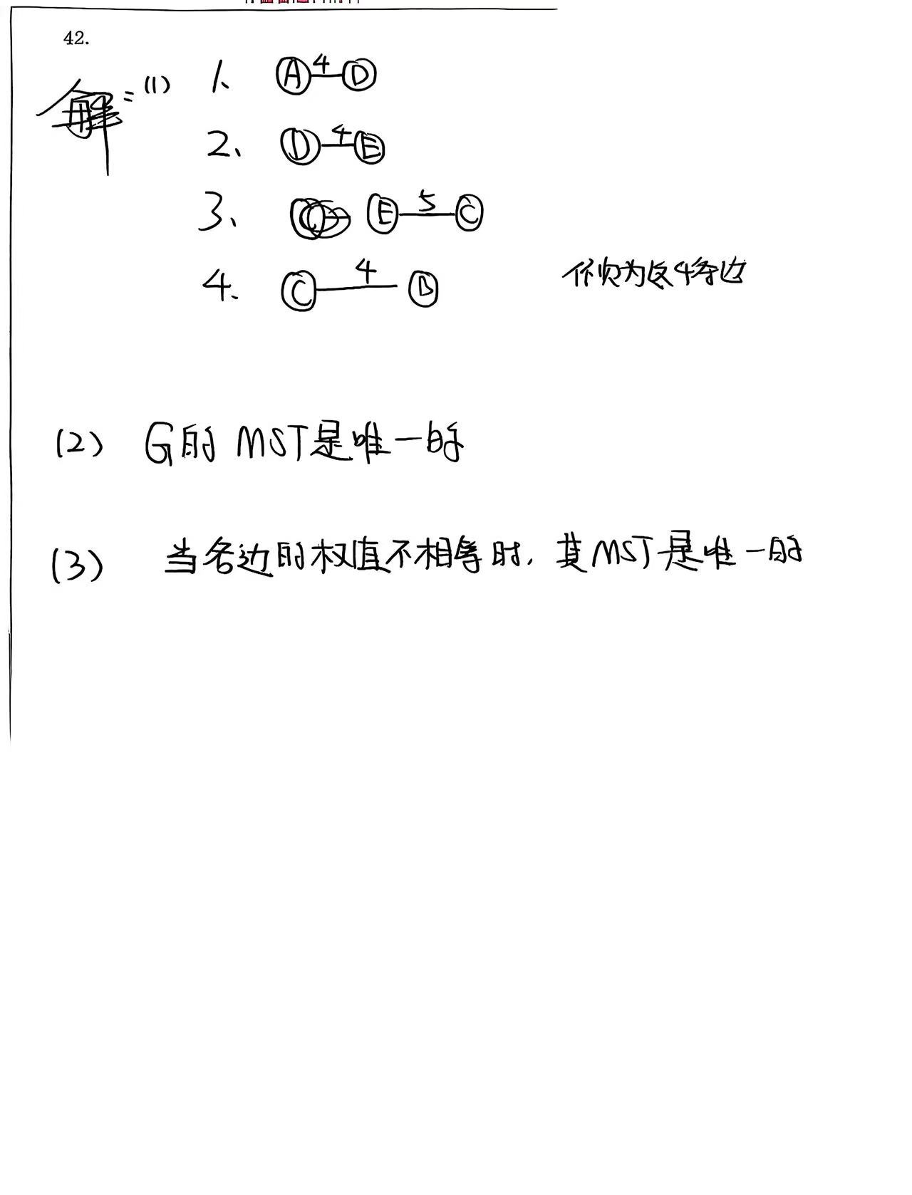 学生两次识别均回答“当各边的权值不相等时,其MST是唯一的”。此说法不严谨,因为即使所有边权值都不相等,但若图中存在环且环中边权值均不相同,则MST唯一;但若边权值不相等但环中存在相同权值边,则MST可能不唯一。标准答案为“当带权连通图的任意一个环中所包含的边的权值均不相同时,其MST是唯一的”。学生答案未强调环的条件,因此扣1分。得1分。