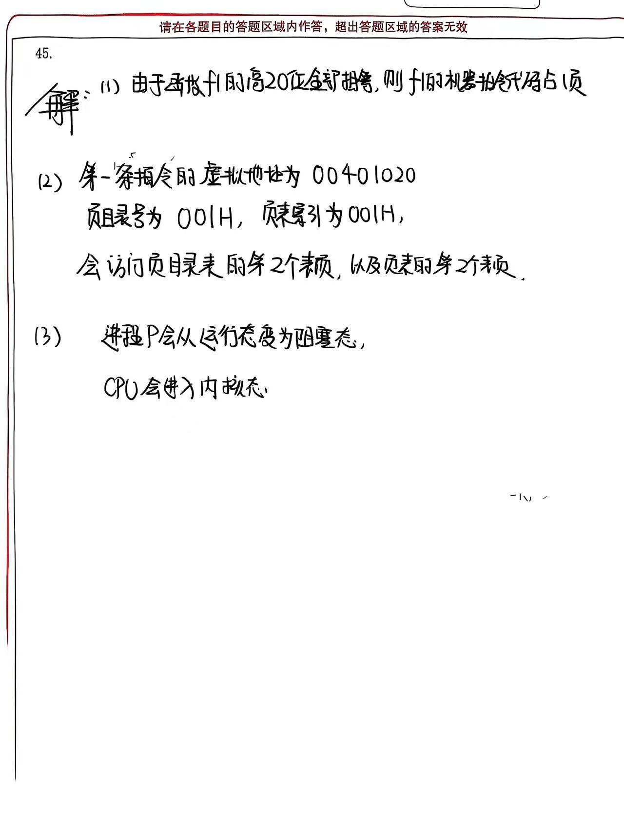学生答案正确指出函数f1的机器指令代码占1页,理由是高20位全部相等,与标准答案一致。得1分。
