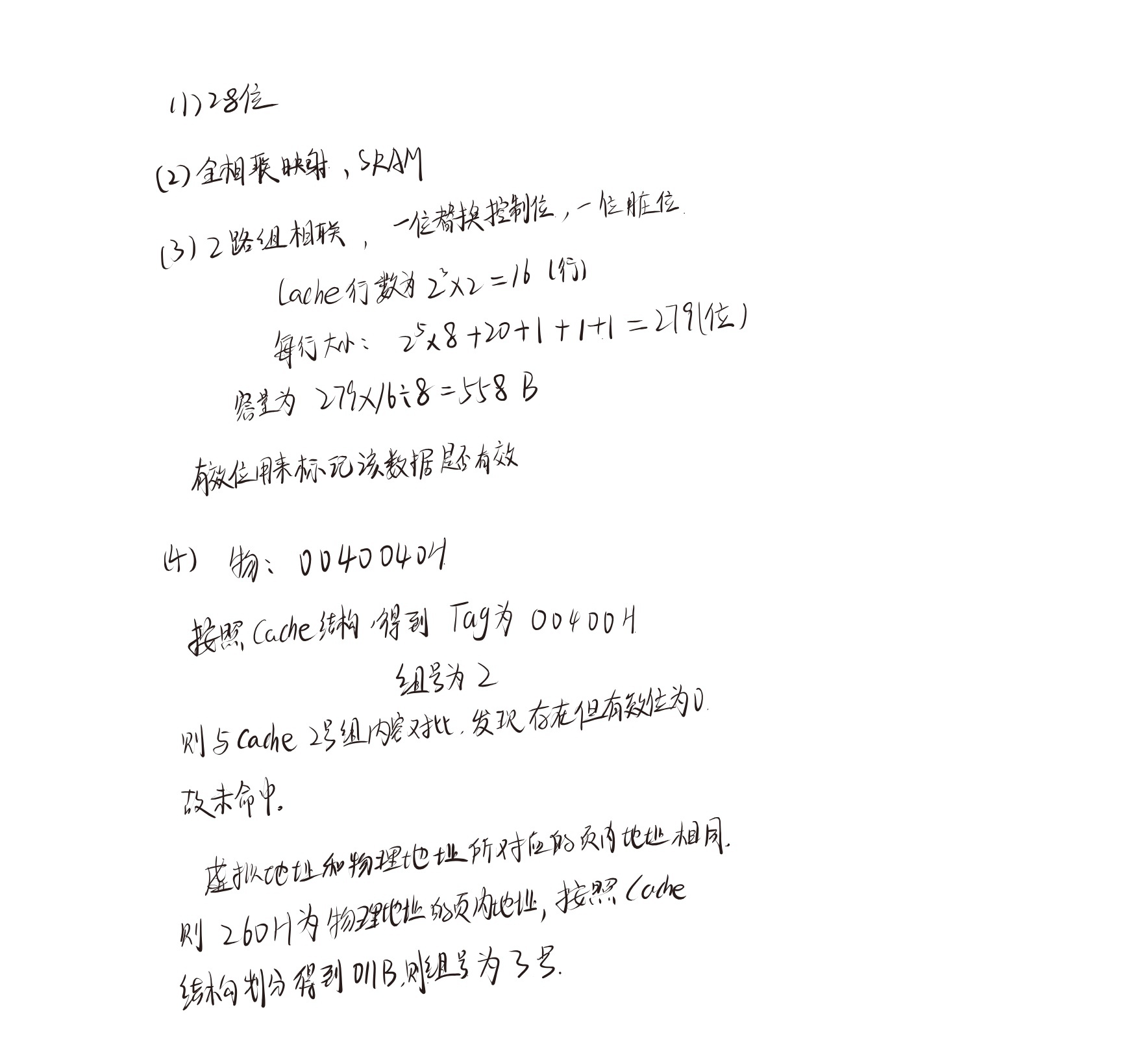 - 物理地址计算有误(第一次识别为00400401H,第二次为00400404H),但根据上下文判断,学生正确计算了Tag为00400H,组号为2,说明其理解地址转换过程,仅最后一位数字识别错误,视为误写不扣分,得2分。
