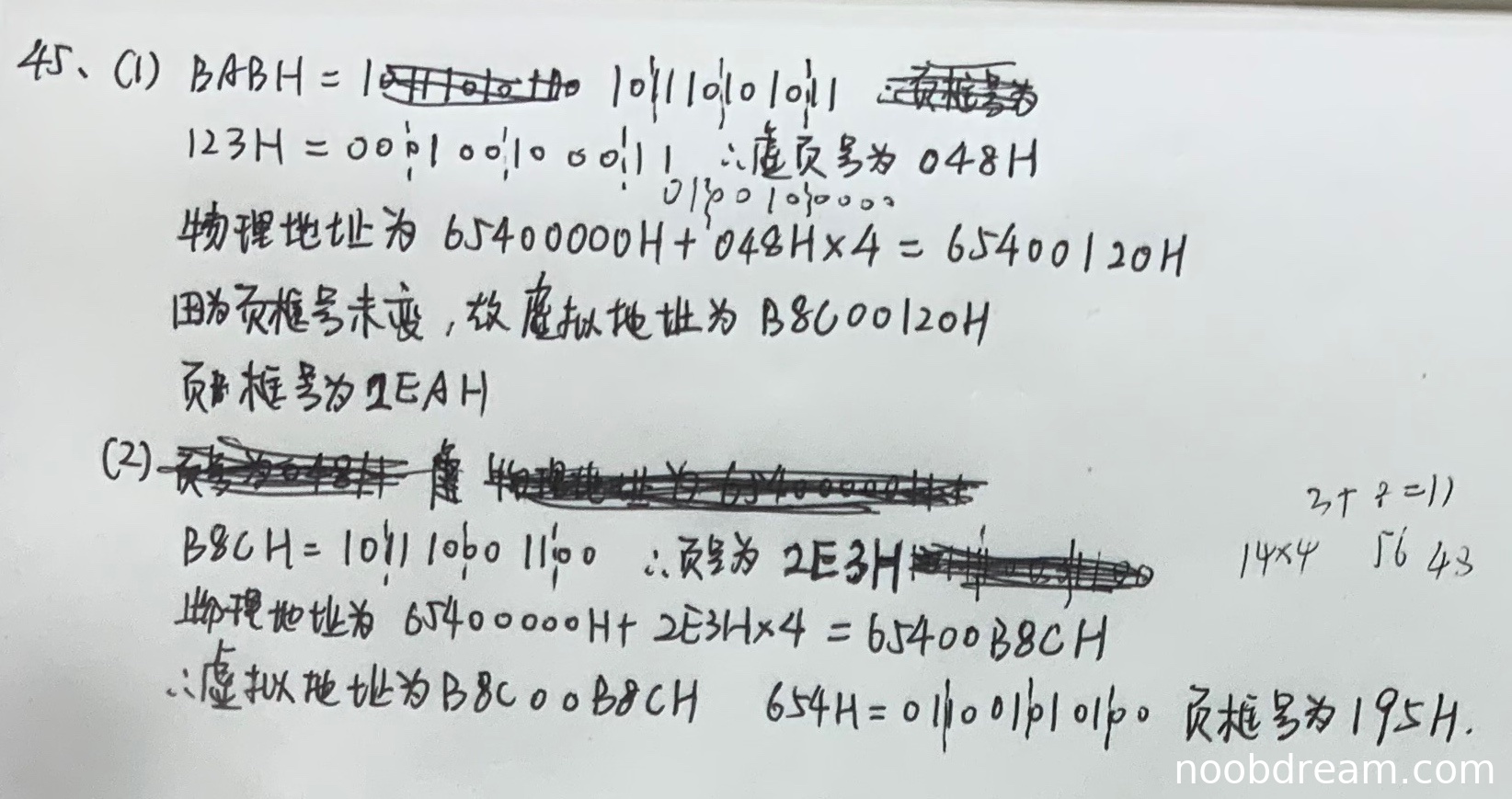 学生答案中,页号2E3H、页表项虚拟地址B8C00B8CH、页框号195H均与标准答案一致。计算过程和结果正确。给分4分。