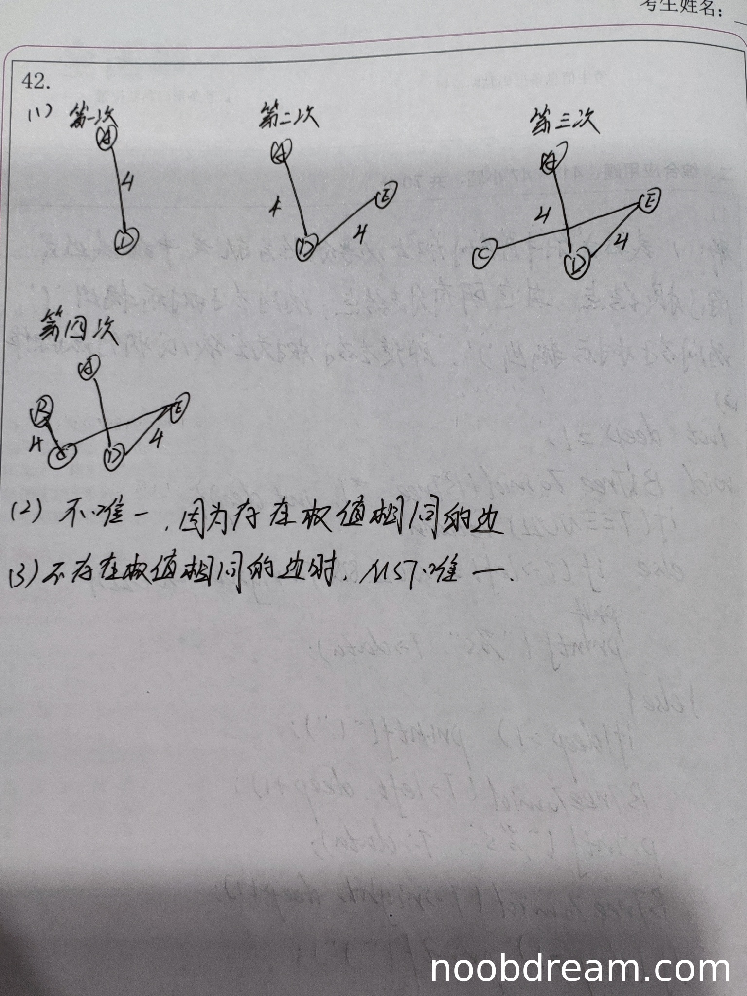 学生回答"不存在权值相同的边时,MST唯一"。这个回答不够准确,因为即使有权值相同的边,只要任意环中的边权值不完全相同,MST仍然可能唯一。标准答案是"当带权连通图的任意一个环中所包含的边的权值均不相同时,其MST是唯一的"。学生回答过于绝对,未准确描述MST唯一的充分条件,得1分。
