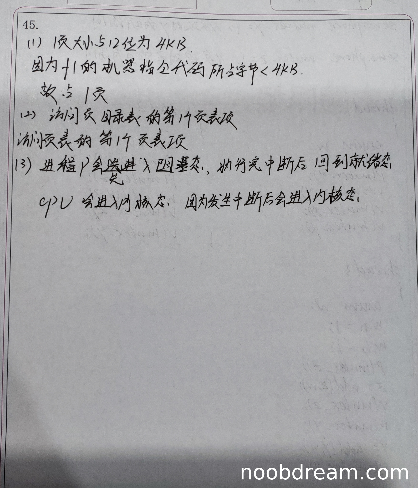 学生两次识别结果均正确判断函数f1的机器指令代码占1页。第一次识别提到页大小4KB(虽然误写为"512位"但根据上下文可判断为误写),第二次识别明确页大小12位为4KB,并正确得出指令代码小于4KB故占1页的结论。思路正确,得1分。