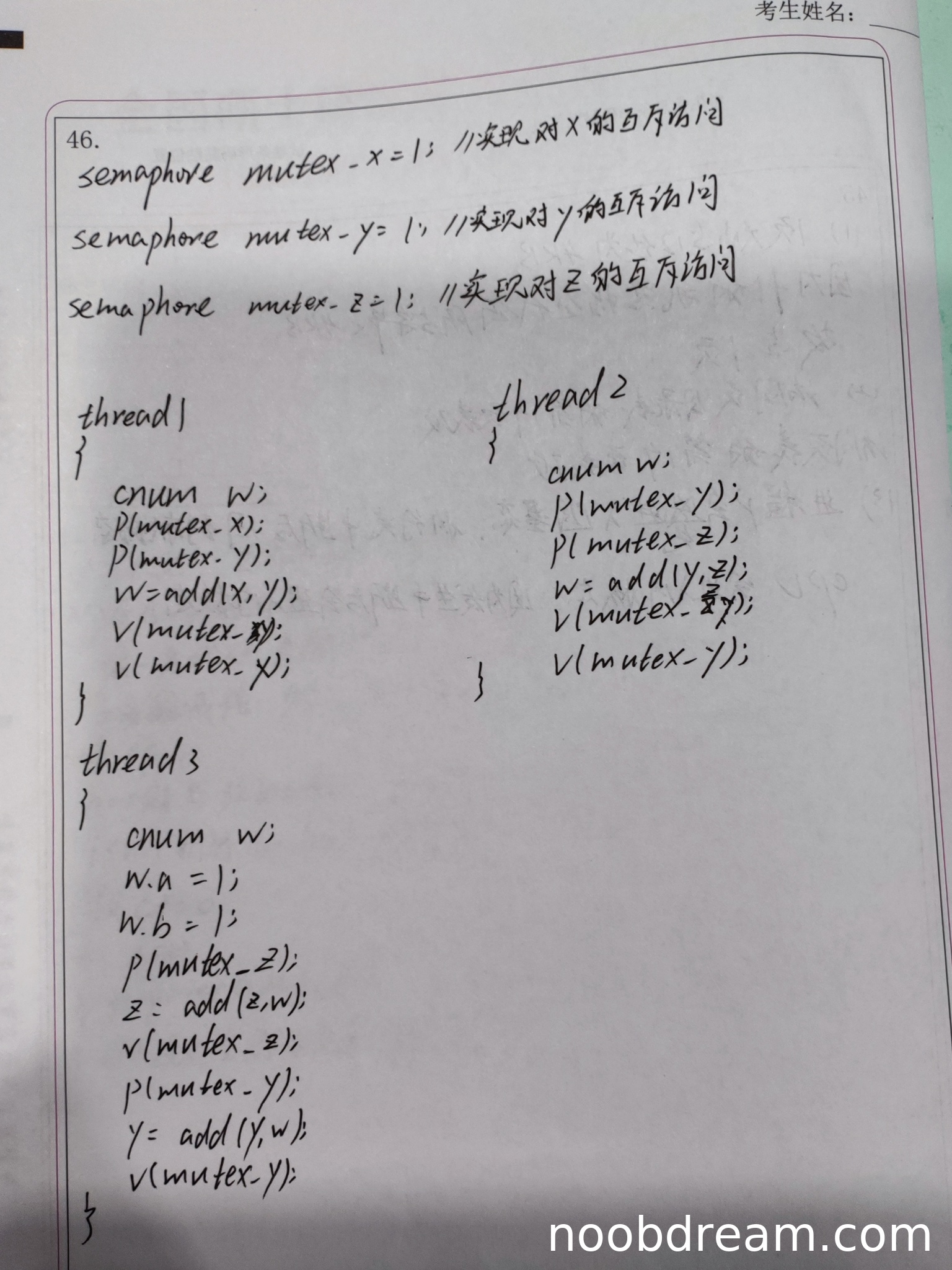学生定义了三个信号量mutex_x、mutex_y、mutex_z,分别用于保护变量x、y、z。但标准答案中针对y变量使用了两个独立的信号量(mutex_y1和mutex_y2),这是为了允许thread1和thread2在thread3不访问y时能够并发执行。学生的方案虽然能保证互斥,但并发度不够高,会不必要地限制thread1和thread2的并发执行。扣1分。