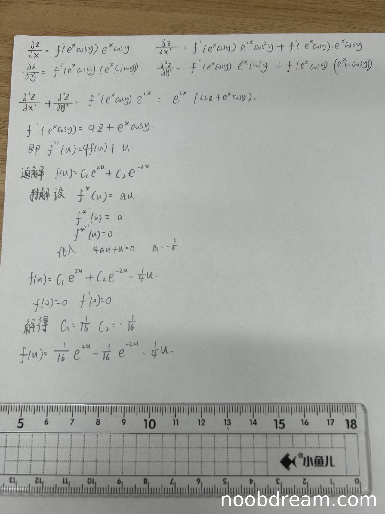 学生作答正确推导了所有偏导数,正确计算了二阶偏导数的和,并正确建立了微分方程 \( f''(u) = 4f(u) + u \)。求解齐次方程和特解的过程正确,应用初始条件求解常数也正确。最终答案与标准答案一致。虽然第一次识别中通解写为 \( C_1 e^{2u} + C_2 e^{-2x} \) 有误(应为 \( e^{-2u} \)),但第二次识别中已纠正,且最终结果正确,因此不扣分。得分:10分。