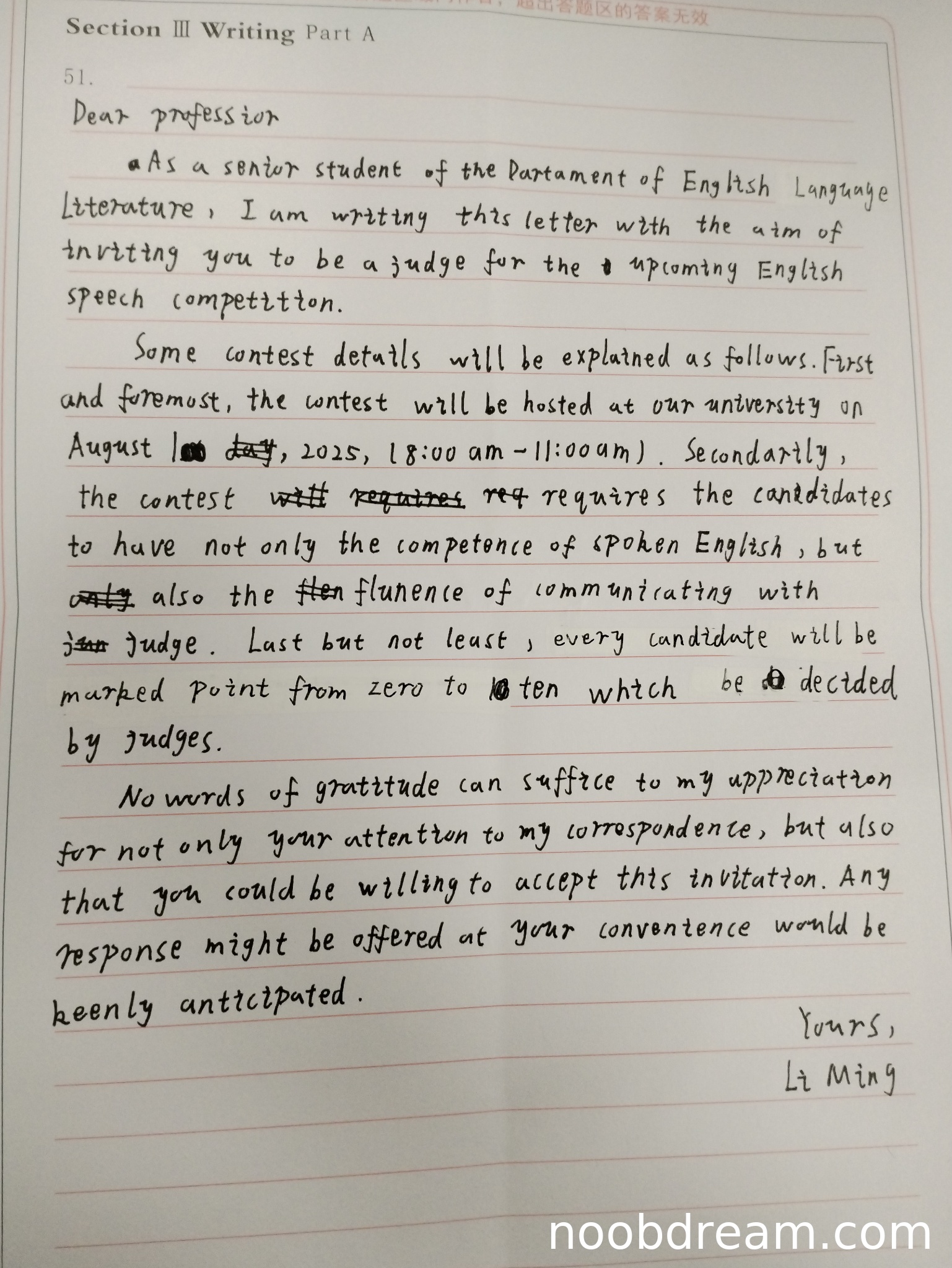 理由:邮件格式基本正确,有称呼、正文、结尾敬语和署名。语域基本恰当,使用了正式的书信语言。但结尾"Yours"的用法不够完整,通常应为"Yours sincerely"或"Sincerely yours"等更正式的表达。