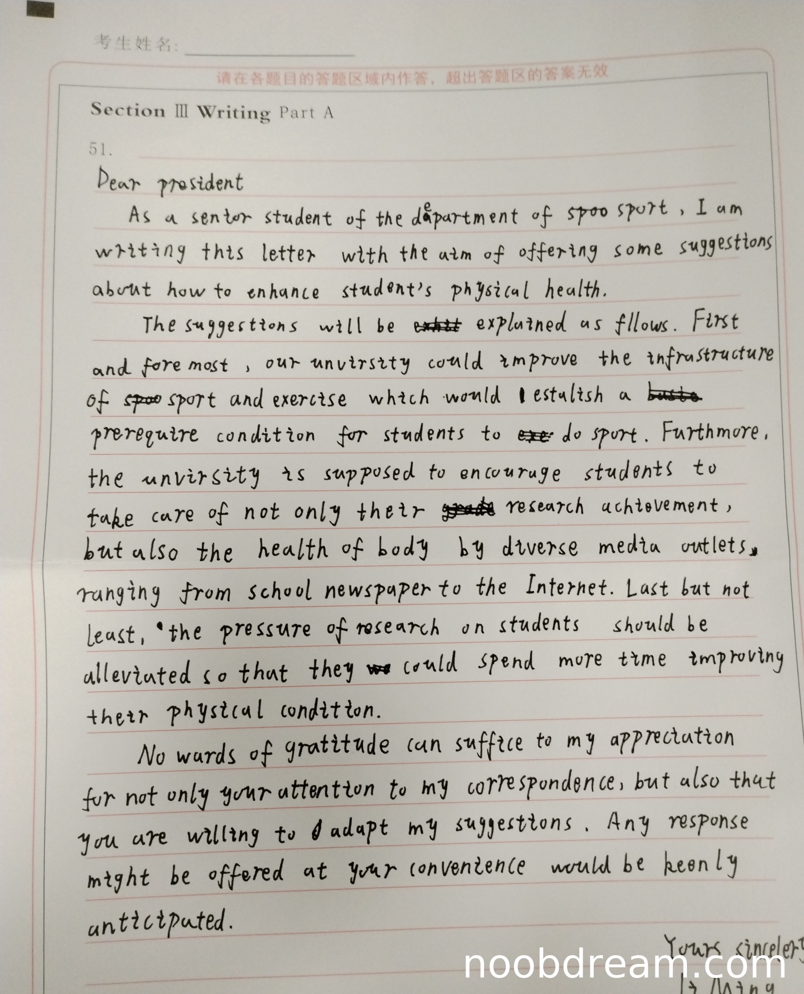 - 内容完整性:信件完整包含了三个具体建议(改善体育设施、通过媒体宣传、减轻科研压力),内容充实且紧扣主题
