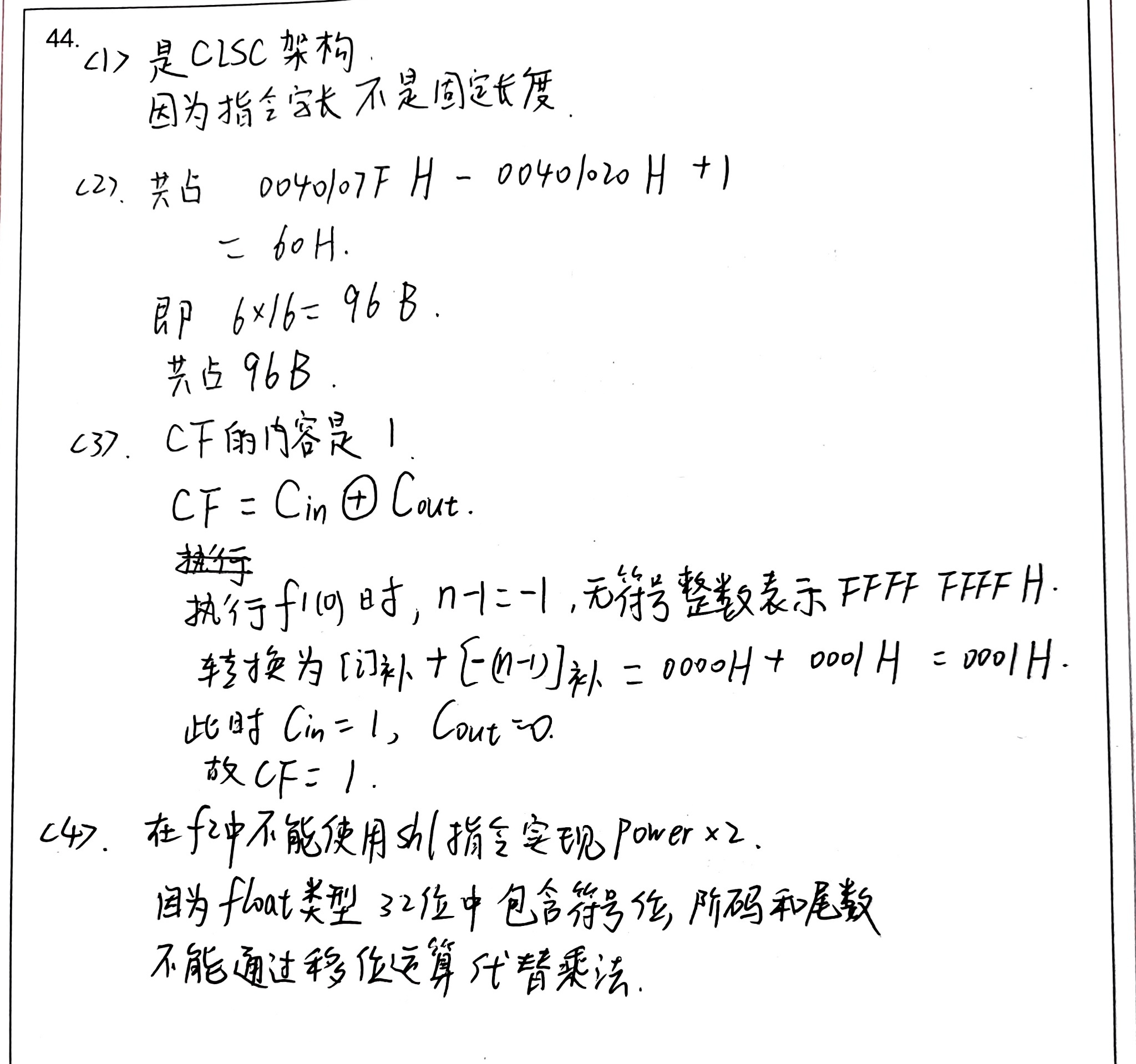 学生正确得出CF=1,但计算过程存在逻辑错误。标准答案中是通过补码减法运算(0减FFFF FFFFH)得到CF=1,而学生使用了错误的公式CF = Cin ⊕ Cout,且计算过程中将“0减FFFF FFFFH”错误地转换为“0000H + 0001H”,这不符合减法运算的实际过程。由于核心结论正确但推导过程有误,扣1分。得2分。