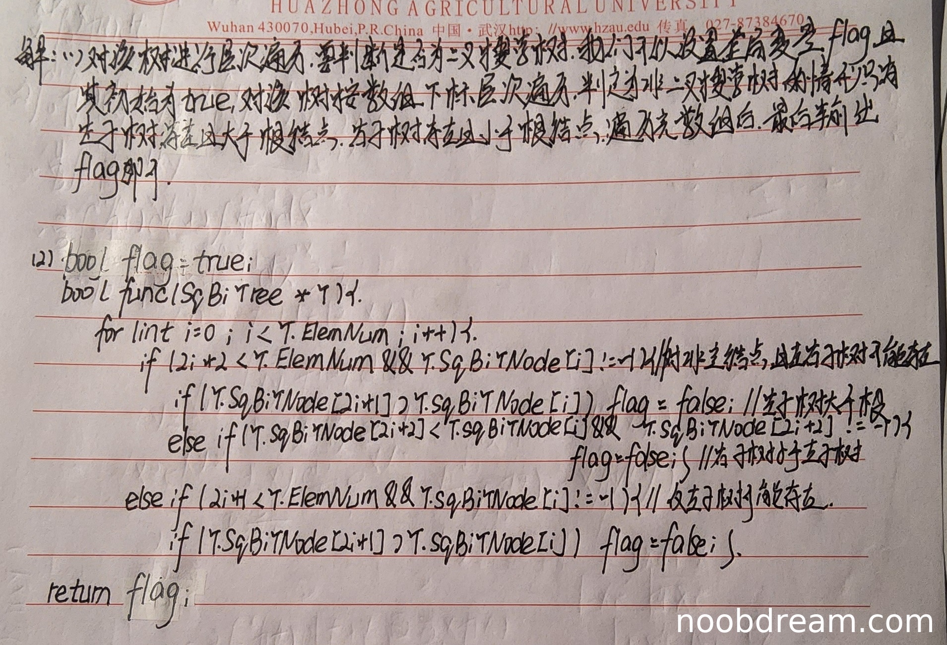 理由:学生提出了层次遍历的基本思路,并提到了二叉搜索树的性质(左子树小于根结点,右子树大于根结点)。但是,这种层次遍历方法只能检查每个结点与其直接子节点的关系,无法验证整个子树的取值范围(例如,右子树的左子树可能小于根结点但大于根结点的父节点),因此设计思想存在根本性缺陷,不能正确判断二叉搜索树。由于给出了部分正确思路,给1分。