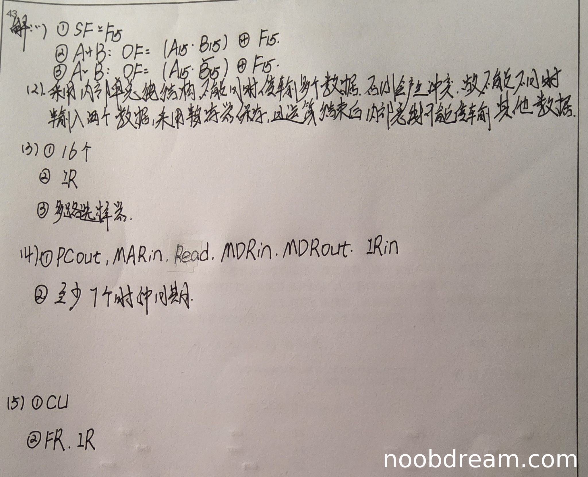 第三问:学生第一次识别结果为OF=(A15·⑤5)⊕F15,第二次识别结果为OF=(A15·¬B15)⊕F15,第二次识别结果正确,与标准答案逻辑等价,因此第三问不扣分。