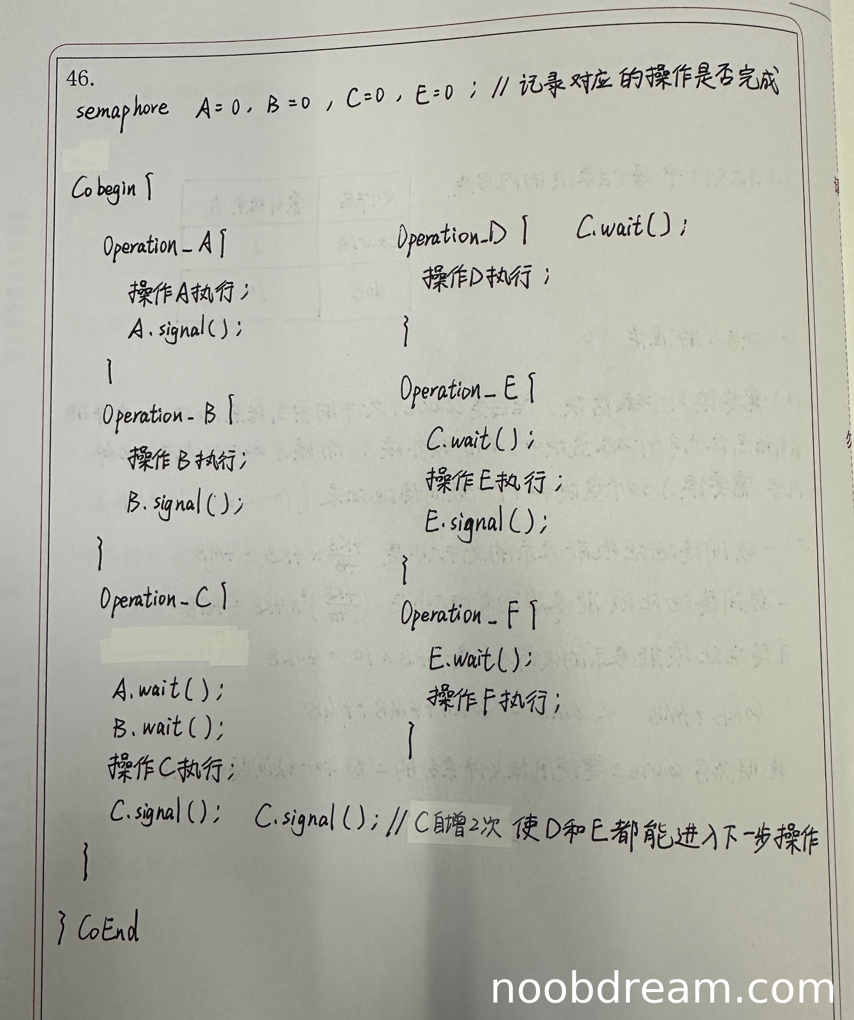 总体评价:学生的答案在同步逻辑上是完全正确的,能够准确描述6个操作之间的执行顺序约束。主要问题是没有按照题目要求的线程划分(T1执行A、E、F,T2执行B、C、D)来组织代码,而是将每个操作都作为独立块处理。这在功能上虽然正确,但不符合题目对线程划分的要求。