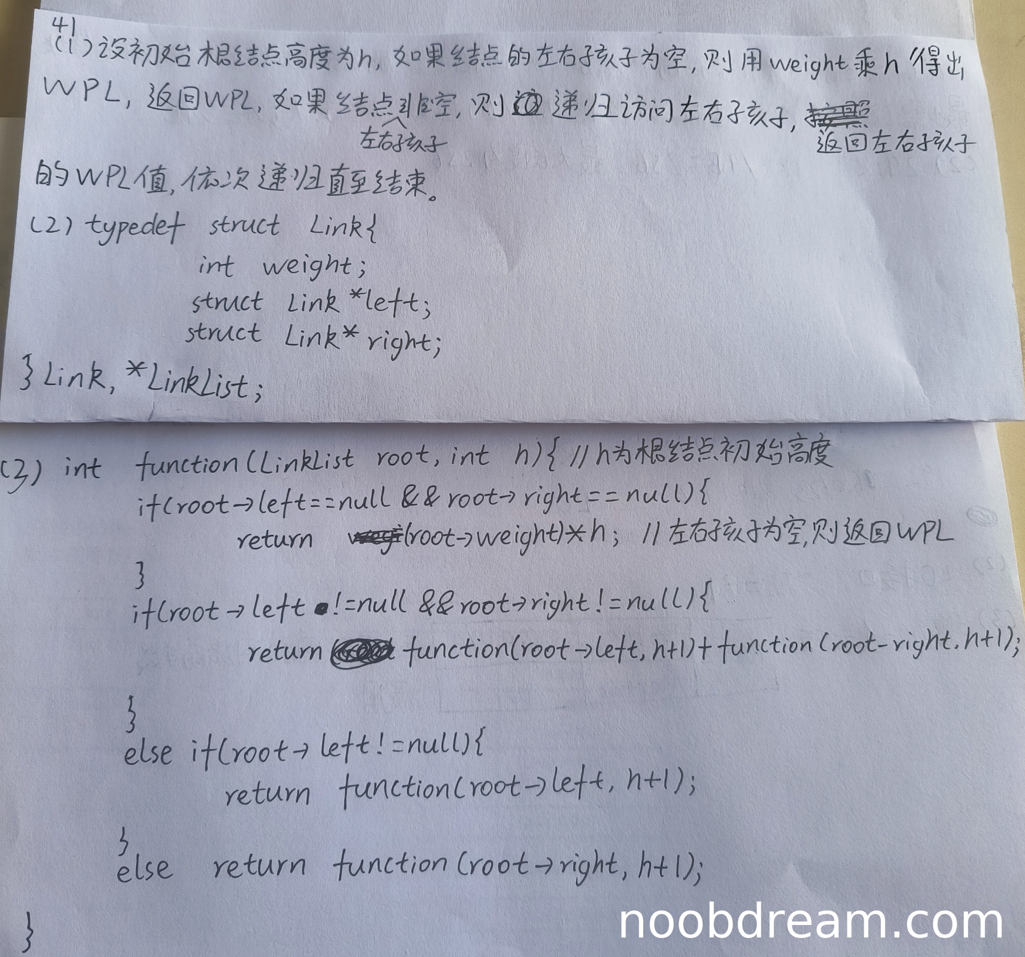 理由:算法实现基本正确,采用了递归遍历的方式,能够正确识别叶子节点并计算权值与深度的乘积。主要问题有: