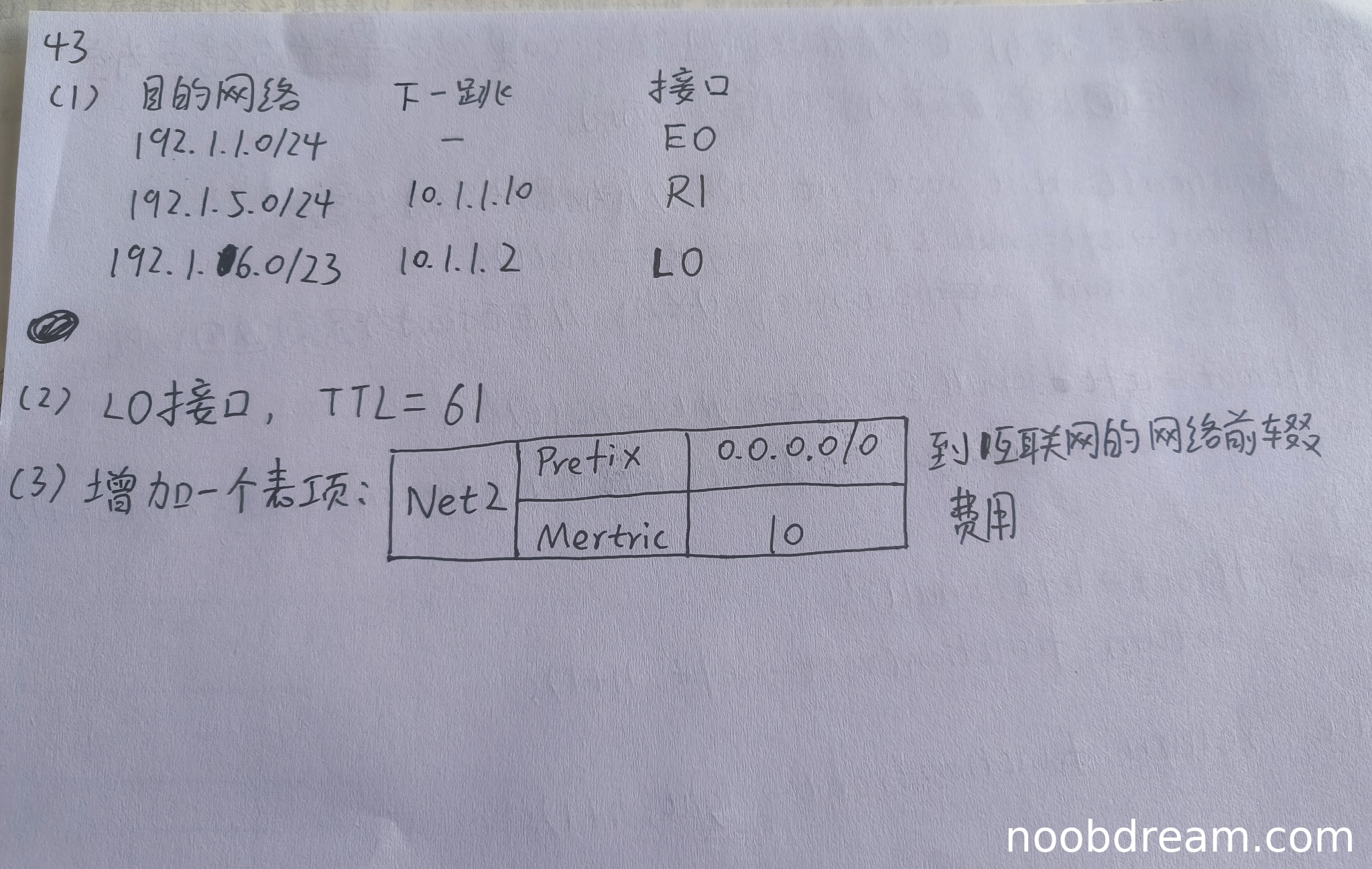 学生答案指出通过L0接口转发,正确,得1分;TTL=61计算正确,得1分。本小题得2分。