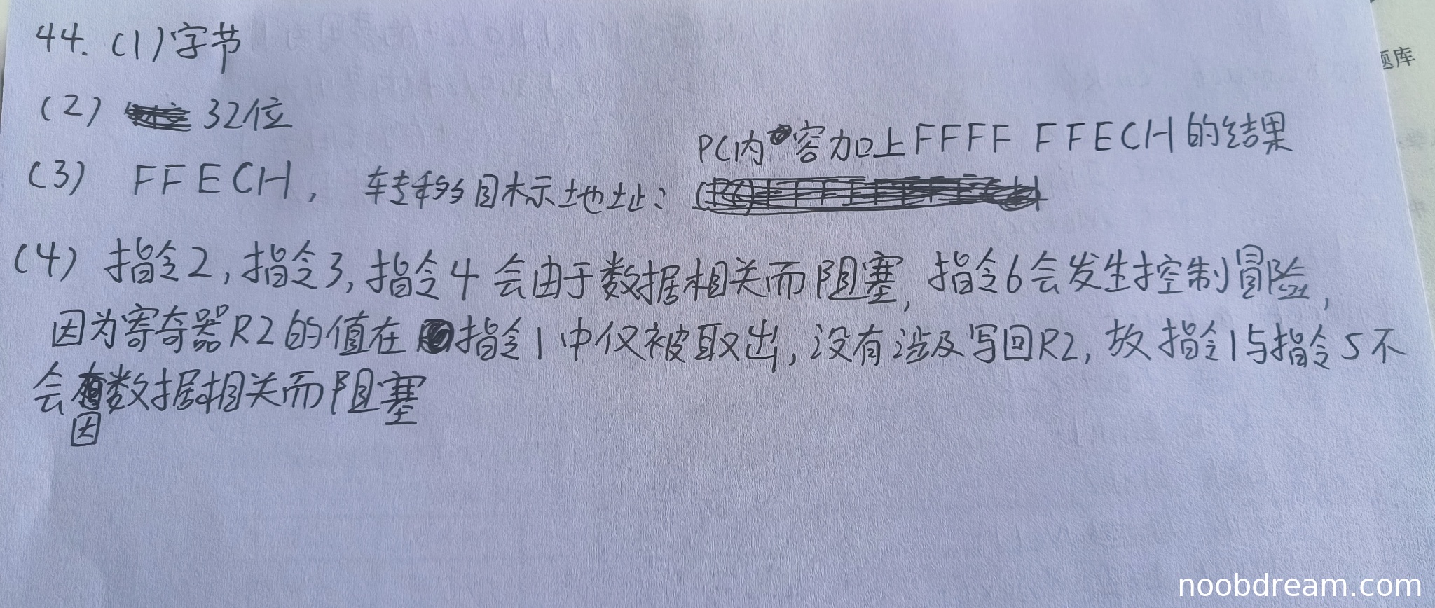 学生回答“指令2、指令3、指令4会由于数据相关而阻塞”,但标准答案还包括指令6(因与指令5数据相关)。此外,学生正确指出指令6会发生控制冒险,并正确解释指令1与指令5无数据相关的原因(指令1未写回R2)。理由:数据相关阻塞指令回答不完整,但控制冒险和指令1与指令5无相关的解释正确。得3分(部分正确)。