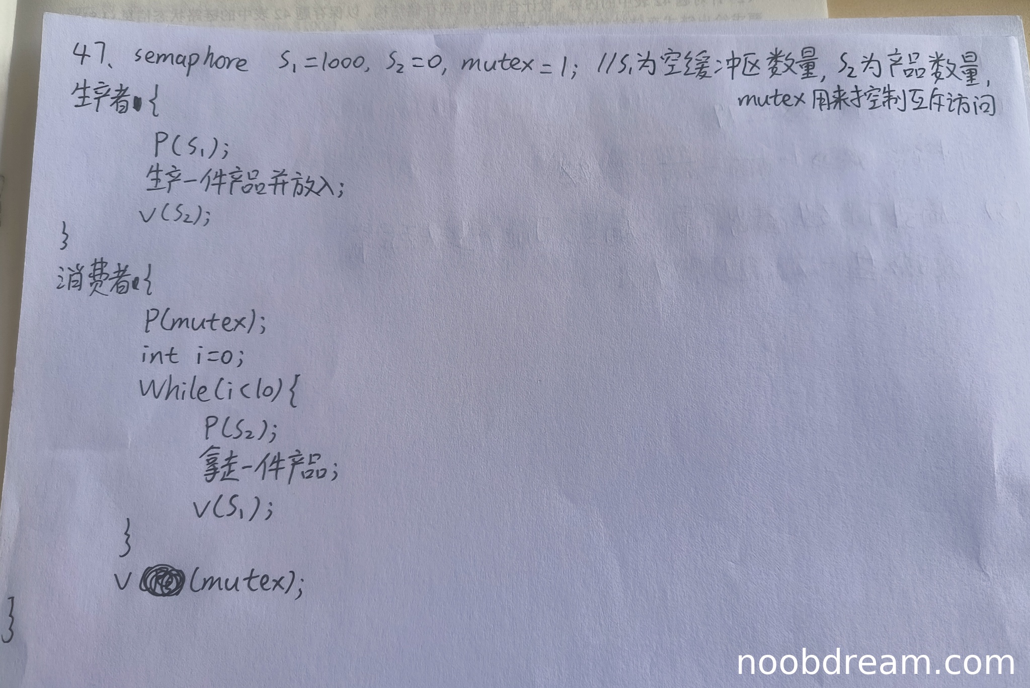 理由:生产者进程的同步操作P(S1)和V(S2)正确(2分),但缺少对缓冲区的互斥访问(缺少P(mutex)和V(mutex)操作),扣1分。