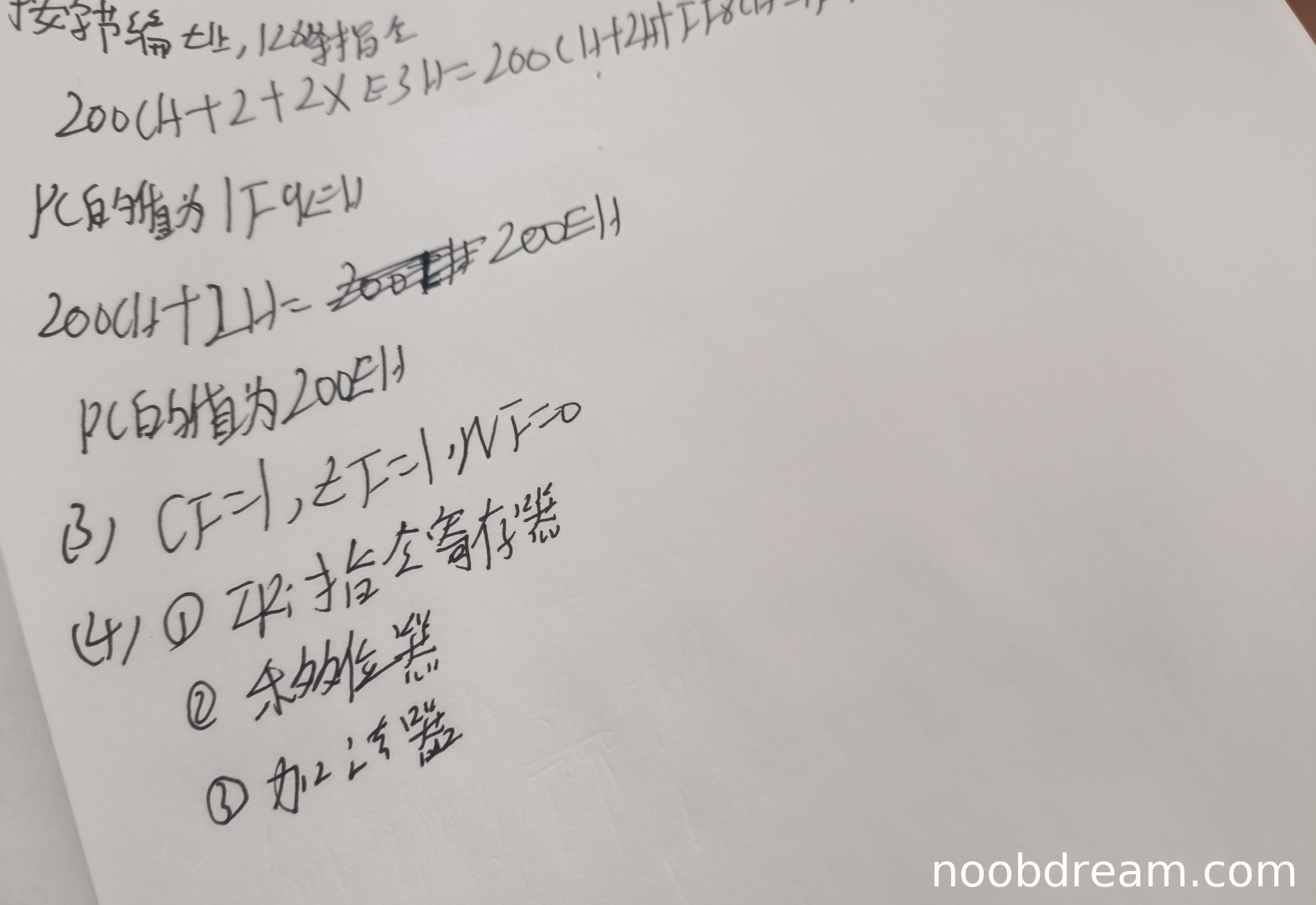 学生未能正确理解指令执行流程,计算过程混乱,结果错误。但学生提到了"PC的值为200E",这与不需要转移时的正确答案200EH部分相符,说明可能有一定理解。