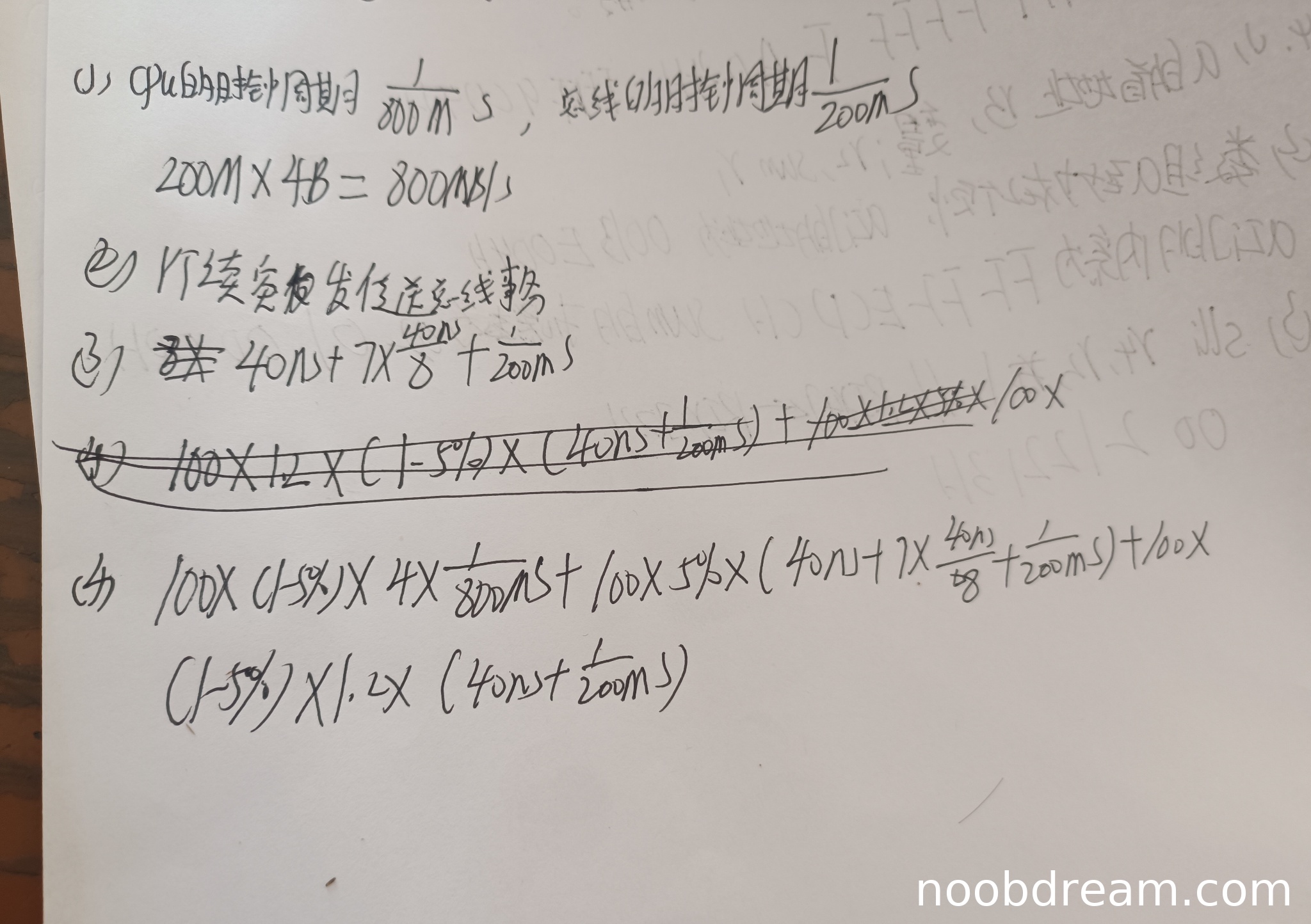 学生答案正确计算了CPU时钟周期(1/800M s)、总线时钟周期(1/200M s)和总线带宽(800MB/s)。虽然第一次识别结果中误写"GPU"为"CPU"的误写,但根据上下文可判断为识别错误,不扣分。答案与标准答案完全一致,得3分。