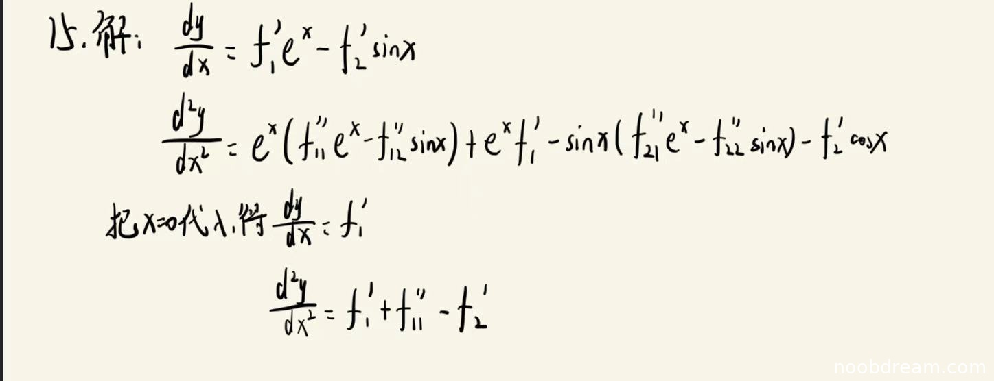 学生正确计算了一阶导数:\(\frac{dy}{dx}=f_{1}'e^{x}-f_{2}'\sin x\),并在代入\(x=0\)后得到\(\frac{dy}{dx}=f_{1}'\),这与标准答案\(f_1'(1,1)\)一致(虽然学生省略了自变量点(1,1),但在这种上下文中通常可以接受)。因此给满分5分。