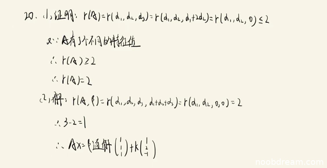 学生答案中,第1次识别结果的特解写成了\(\begin{pmatrix} 1 \\ 1 \end{pmatrix}\),维数错误,扣2分;第2次识别结果的基础解系写成了\(\begin{pmatrix}1\\1\\ - 1\end{pmatrix}\),与正确的\(\begin{pmatrix}1\\2\\ - 1\end{pmatrix}\)不符,扣2分。但两次识别中至少有一次基础解系或特解有部分正确,且思路基本正确,综合考虑扣3分。得3分。