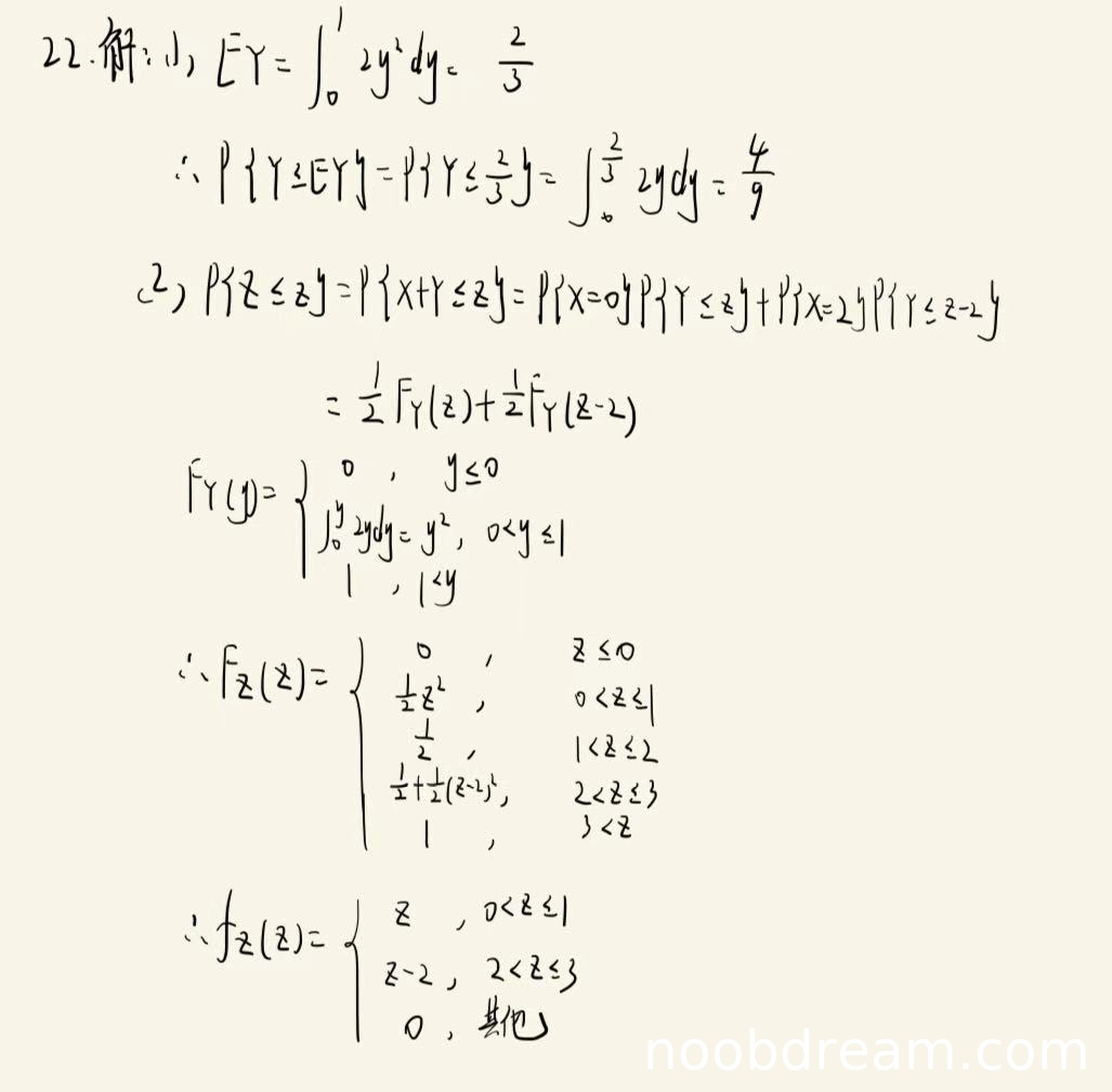 学生正确计算了EY = ∫₀¹ 2y² dy = 2/3,并正确计算了P{Y ≤ EY} = ∫₀^(2/3) 2y dy = 4/9。计算过程完整,结果正确。得5分。
