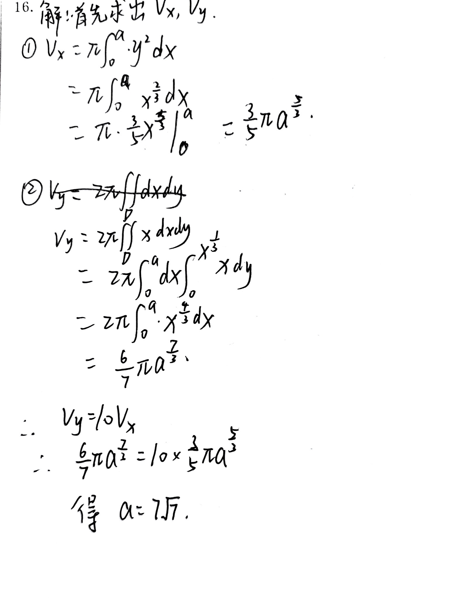 - 根据条件 \(V_y = 10V_x\) 建立方程 \(\frac{6}{7}\pi a^{7/3} = 10 \times \frac{3}{5}\pi a^{5/3}\),化简后得到 \(a^{2/3} = 7\),解得 \(a = 7\sqrt{7}\),过程正确。