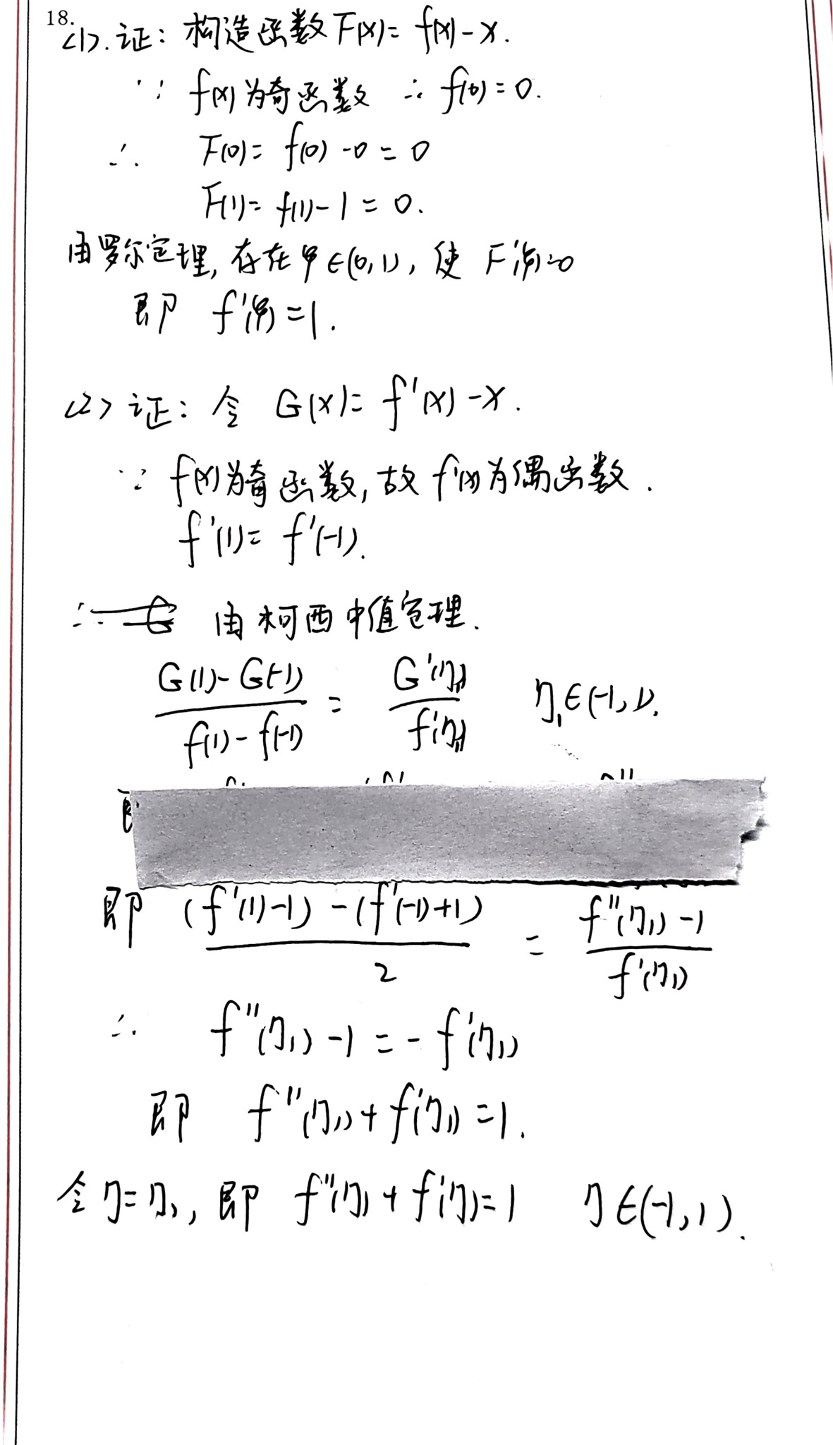 第1次识别结果:存在逻辑错误。学生构造G(x)=f'(x)-x,但后续应用柯西中值定理时,分母使用f(1)-f(-1)=2,分子为G(1)-G(-1)。这里存在两个问题:一是柯西中值定理要求两个函数在闭区间连续、开区间可导且分母导数不为零,但f'(η)在(-1,1)内可能为零;二是计算G(1)-G(-1)时,由f'(1)=f'(-1)得到结果为-2,最终推导出f''(η)+f'(η)=1,但这一推导过程不够严谨,且未说明η在(0,1)内。