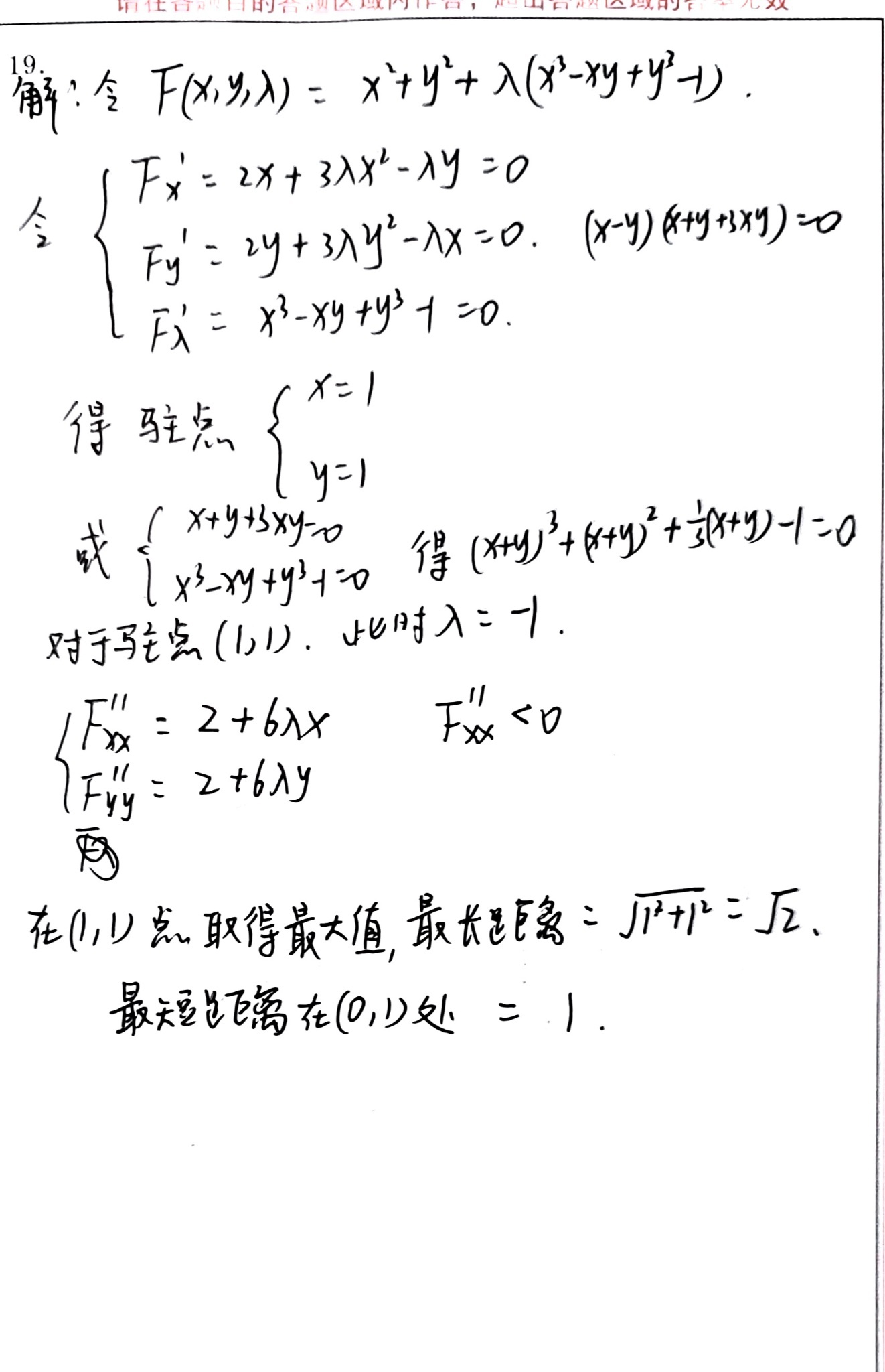 - 第二次识别中,拉格朗日函数构造有误:约束条件写成了 \(x^3 - xy + y^3 + 1\),而不是正确的 \(-1\),这是一个逻辑错误,扣1分。