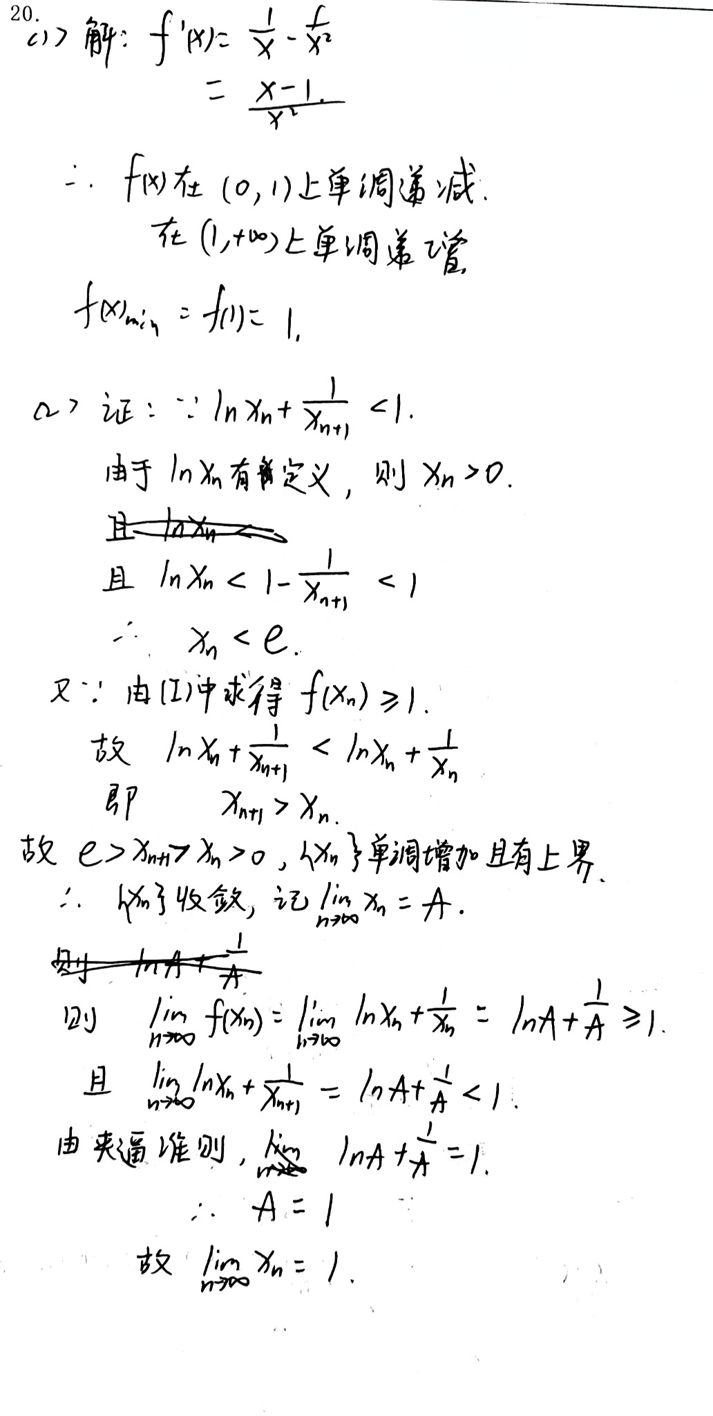 第2次识别结果:同样存在条件错误(ln xₙ + 1/xₙ₊₁ < 1),但推理过程完整,单调性和有界性证明思路正确,极限计算过程合理。由于条件错误是根本性错误,扣2分,得4分。