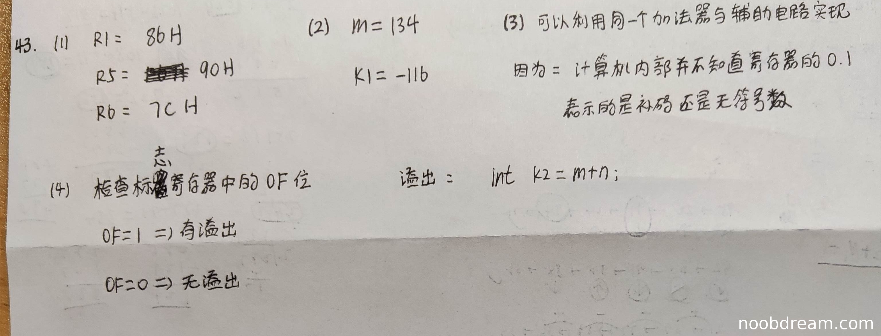 学生回答判断方法是"检查标志寄存器中的OF位",并正确指出"int k2 = m + n"会溢出。但标准答案要求说明具体的溢出判断方法(最高位进位和符号位进位不同),学生没有详细说明判断原理,只提到了OF位,不够完整。根据逻辑错误扣分原则,扣1分。本题得2分。